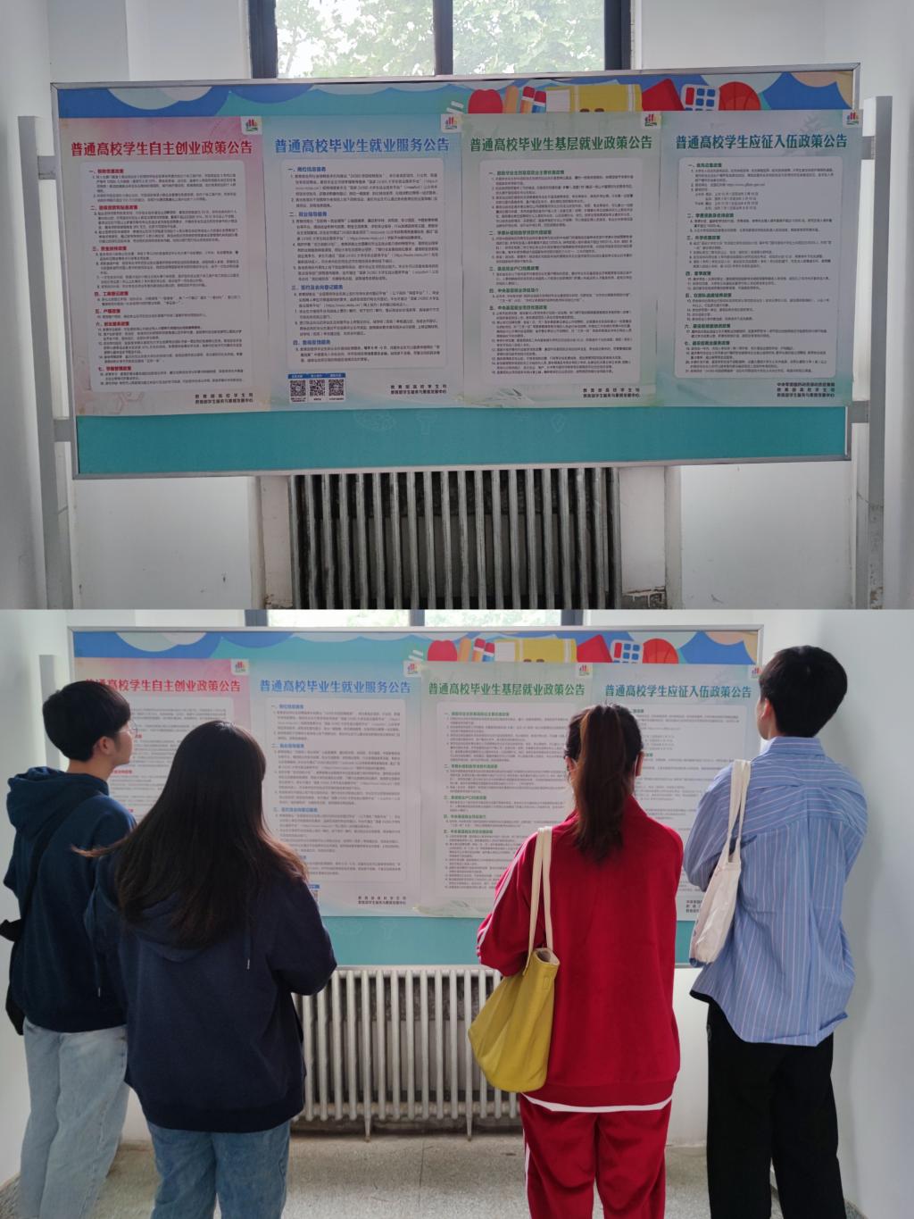 公司专门制作了宣传展板,教学一号楼三楼公告栏上分别张贴《普通高校员工自主创业政策公告》、《普通高校毕业生就业服务公告》、《普通高校毕业生基层就业政策公告》、《普通高校员工应征入伍政策公告》四项公告。让员工在去辅导员办公室办理事务时能够第一时间看到,同时通过图片转发的方式广泛告知广大毕业生,进一步提升同学们对基本就业政策的认识。(图文:胡颖慧审核石皓召)
