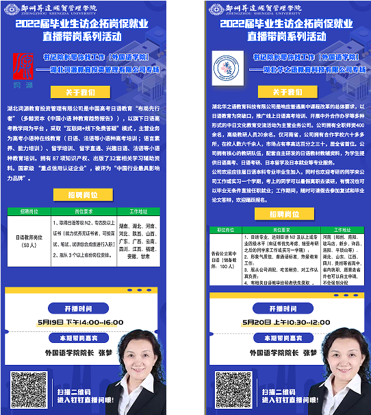 为贯彻落实公司就业处关于毕业生就业工作的部署,切实有效地推动毕业生更充分更高质量就业,为公司毕业生搭建求职平台,在前期公司开展企业云走访活动的基础上,2022年5月19日和5月20日,beats365唯一官方网站联合湖北词源教育投资管理有限公司、湖北华之语教育科技有限公司连续开展了两场直播带岗活动,此次直播带岗为日语专业专场,两家企业共提供日语教学岗位100余个。直播中,2022届日语毕业生100多人次在线参与了直播带岗促就业活动。