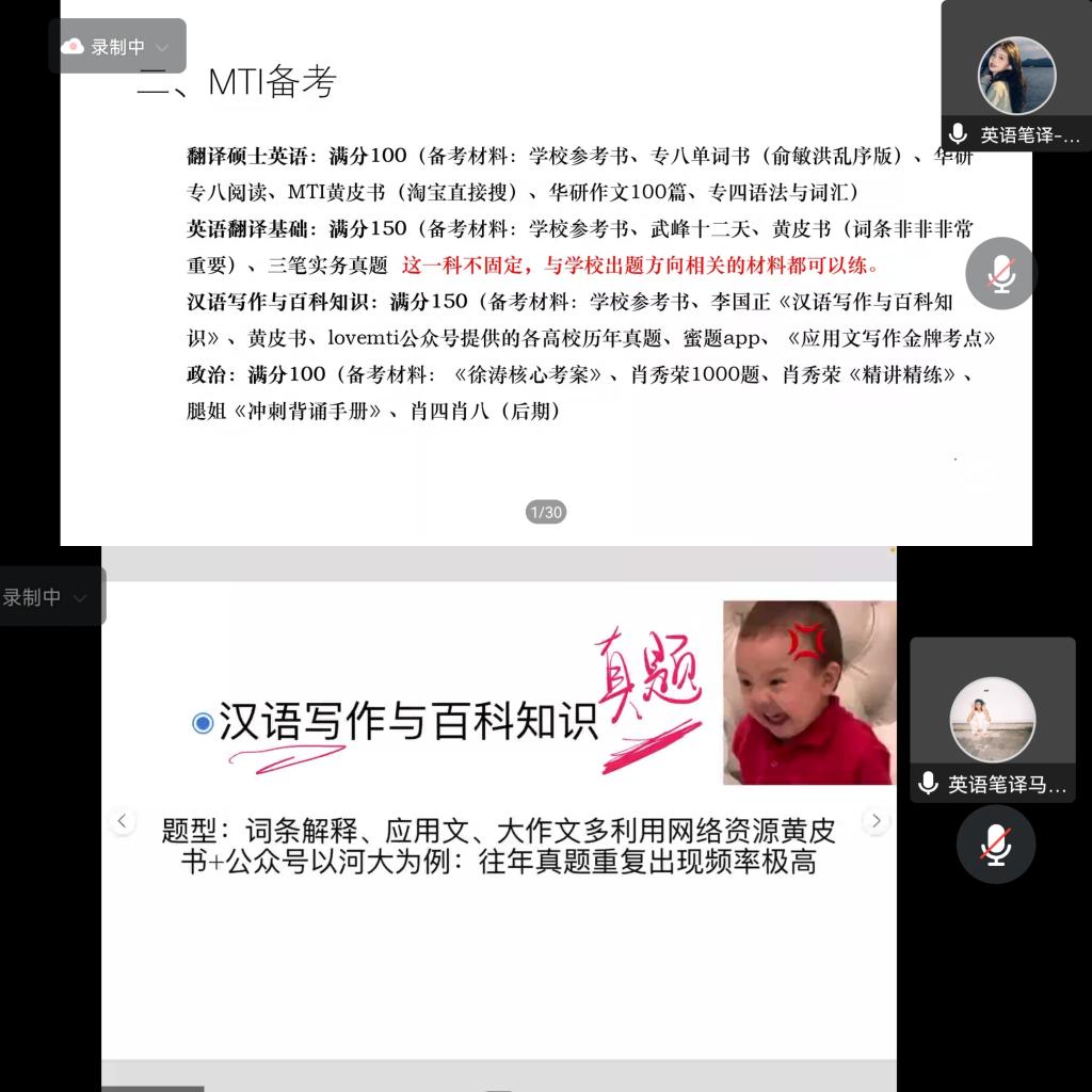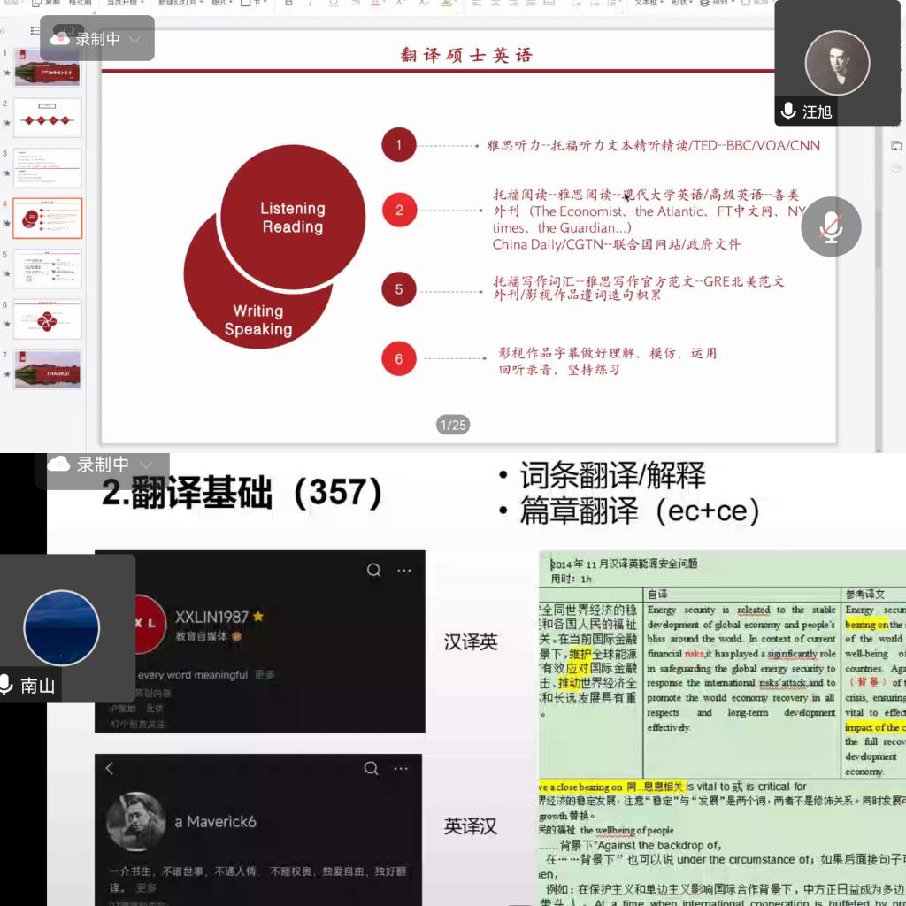 2022年10月21日晚7:00-9:20,翻译专业教研室响应公司和公司疫情期间调节心态和坚持学习的号召,为翻译专业大一至大三同学举办了线上考研经验分享讲座,邀请了现就读于上海交通大学英语笔译专业的汪旭同学、首都经济贸易大学英语口译专业的马彦同学,及两位翻译专业员工:就读于山西师范大学英语笔译专业的陈晓同学和河南大学英语笔译专业的马睿涵同学。翻译专业200余位师生参加了本次讲座。