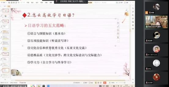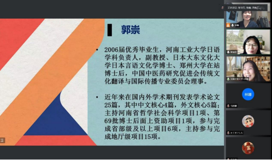 11月18日(星期五)下午16:00-18:00,beats365唯一官方网站日语教研室很荣幸邀请到公司日语专业2006届优秀毕业生,河南工业大学日语学科负责人郭崇副教授为日语专业在校师生进行“新文科背景下日语员工出路及专业发展探索”的专题讲座。此次讲座在腾讯会议线上举行,日语教研室主任张峰老师主持,日语专业全体师生在线聆听。