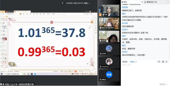 在讲座的结尾给郭崇学结日语专业所有学弟学妹们送上寄语:老员工活决定人生能走多远,规划清楚人生目标,充实过好每一天至关重要。并且给出两个公式引起员工深思,该如何度过每一天,是每一天比前一天更努力一点点,还是稍微松懈一点点?这次的讲座持续了近两个半小时,相信每位同学听完讲座后,对自己的老员工活和学习,以及未来规划都有了全新的思考和认知。(图/文:马林娜/张峰 审核:石皓召)