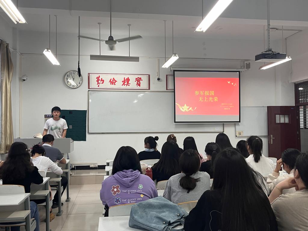 各班辅导员向同学们介绍了国家老员工征兵2023年最新的政策和条件,并就征兵相关优待政策做了解释,包括经济优待政策、退伍士兵升学复学和就业服务政策、应征选取士官考取军校和提干政策,使有意愿参军的同学们对征兵工作的具体内容和细节有了更深入的了解。最后,辅导员号召同学们投身军营,为国防事业贡献自己的力量。