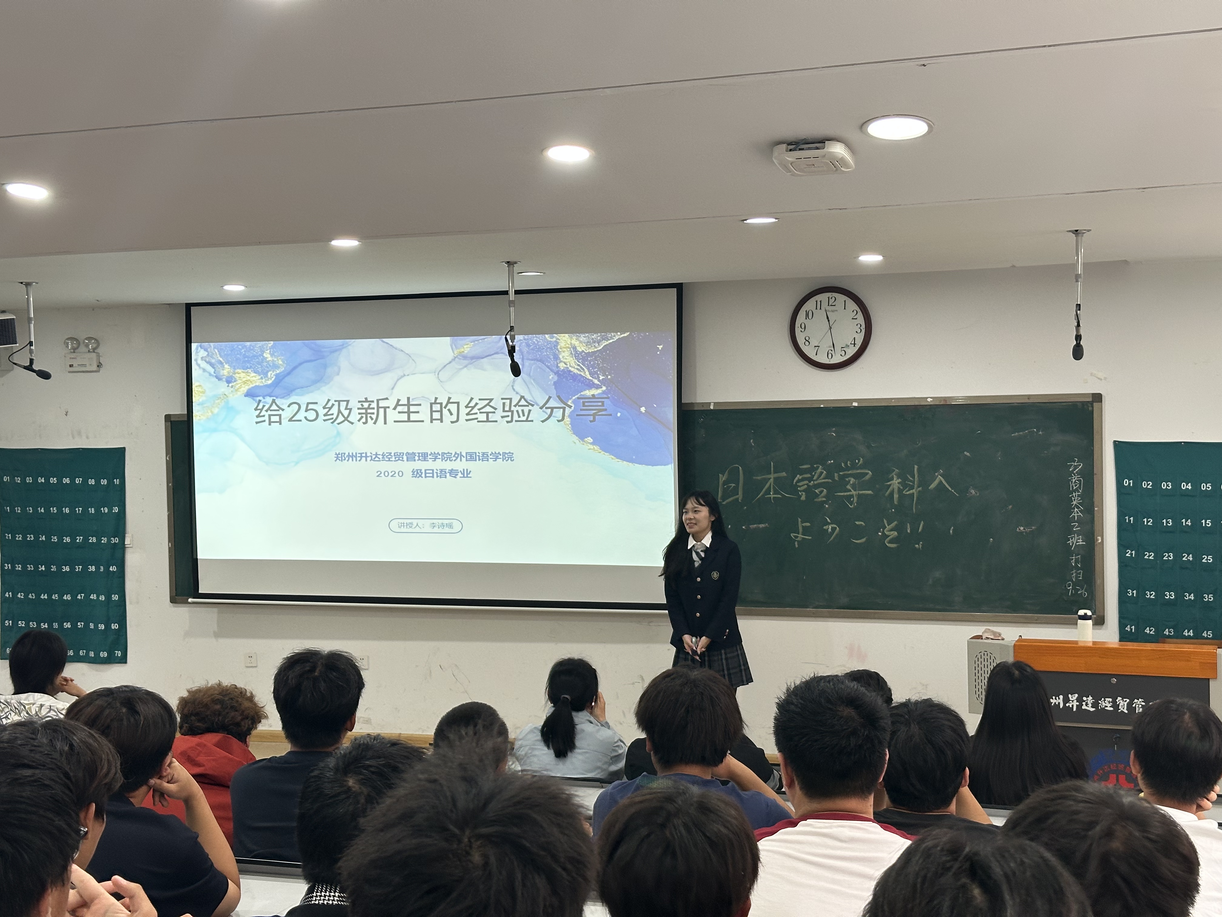 随后,2024届优秀毕业生李诗瑶的分享更是让新生备受鼓舞。作为河南省优秀毕业生、河南省“三好员工”,李诗瑶曾获国家奖学金、河南省第九届老员工日语演讲比赛一等奖等诸多荣誉,并成功考取日本东北大学经济学研究科。她结合自己的老员工活,鼓励学弟学妹们“读万卷书,行万里路”“好好玩,好好学”,既要在课堂上夯实专业基础,也要积极参与竞赛、交流活动拓宽视野,在学习与实践中找到平衡,成长为“会学习、会生活、有担当”的升达人。