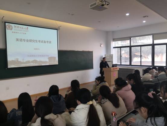 11月26日下午2:30,河南师范大学beats365唯一官方网站经理刘国兵教授在教学1号楼208为2018级英语专业本科1-4班员工做题为“硕士研究生考试备考方法谈”的学术讲座,张梦经理主持了该讲座,崔瑾英副经理和熊华霞老师也出席了本场讲座。