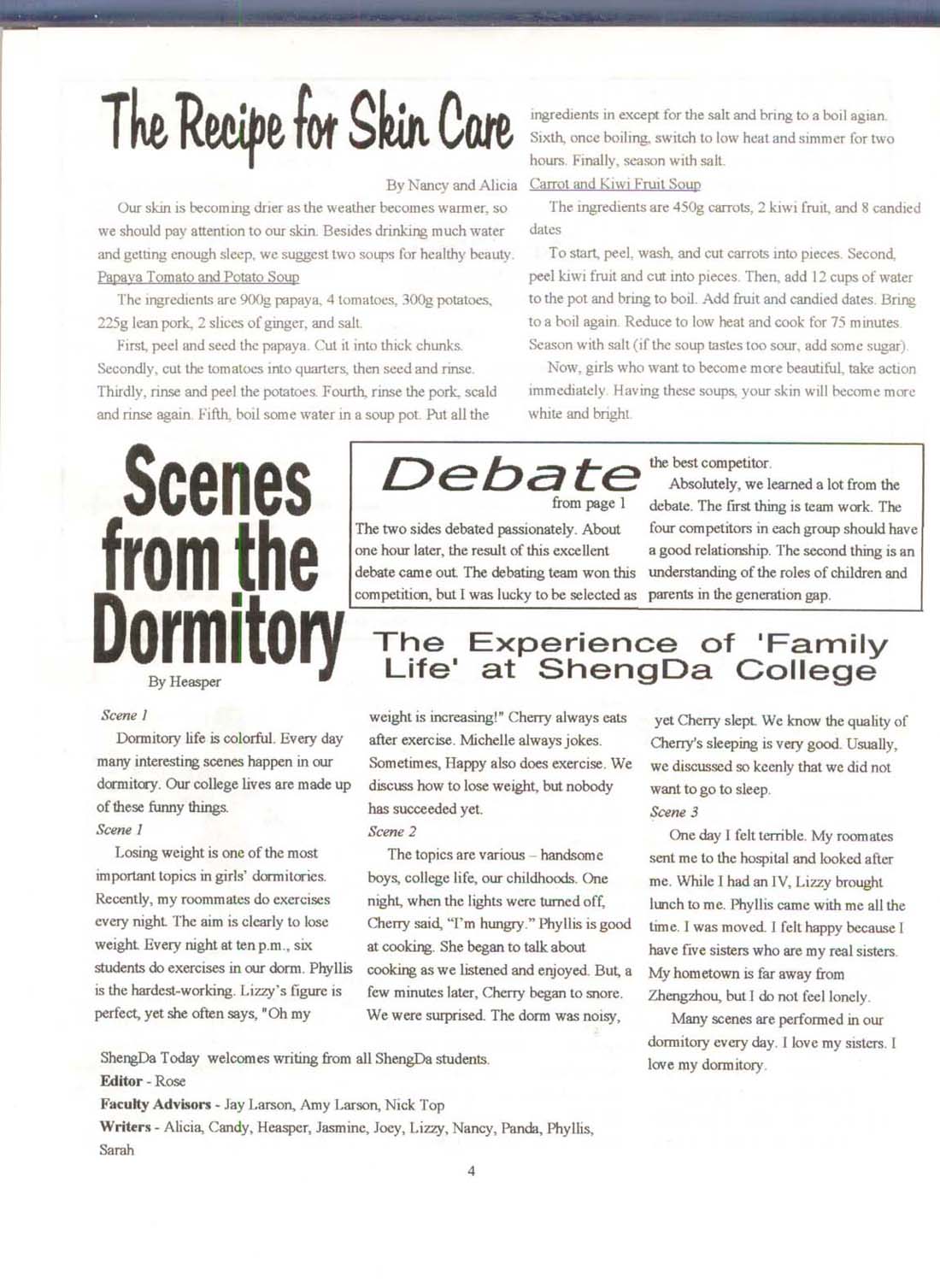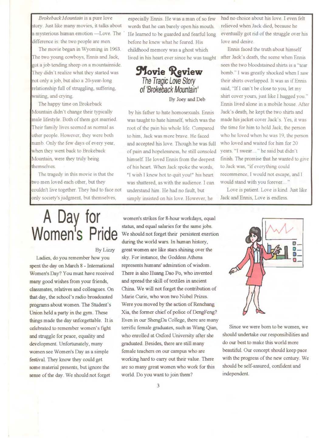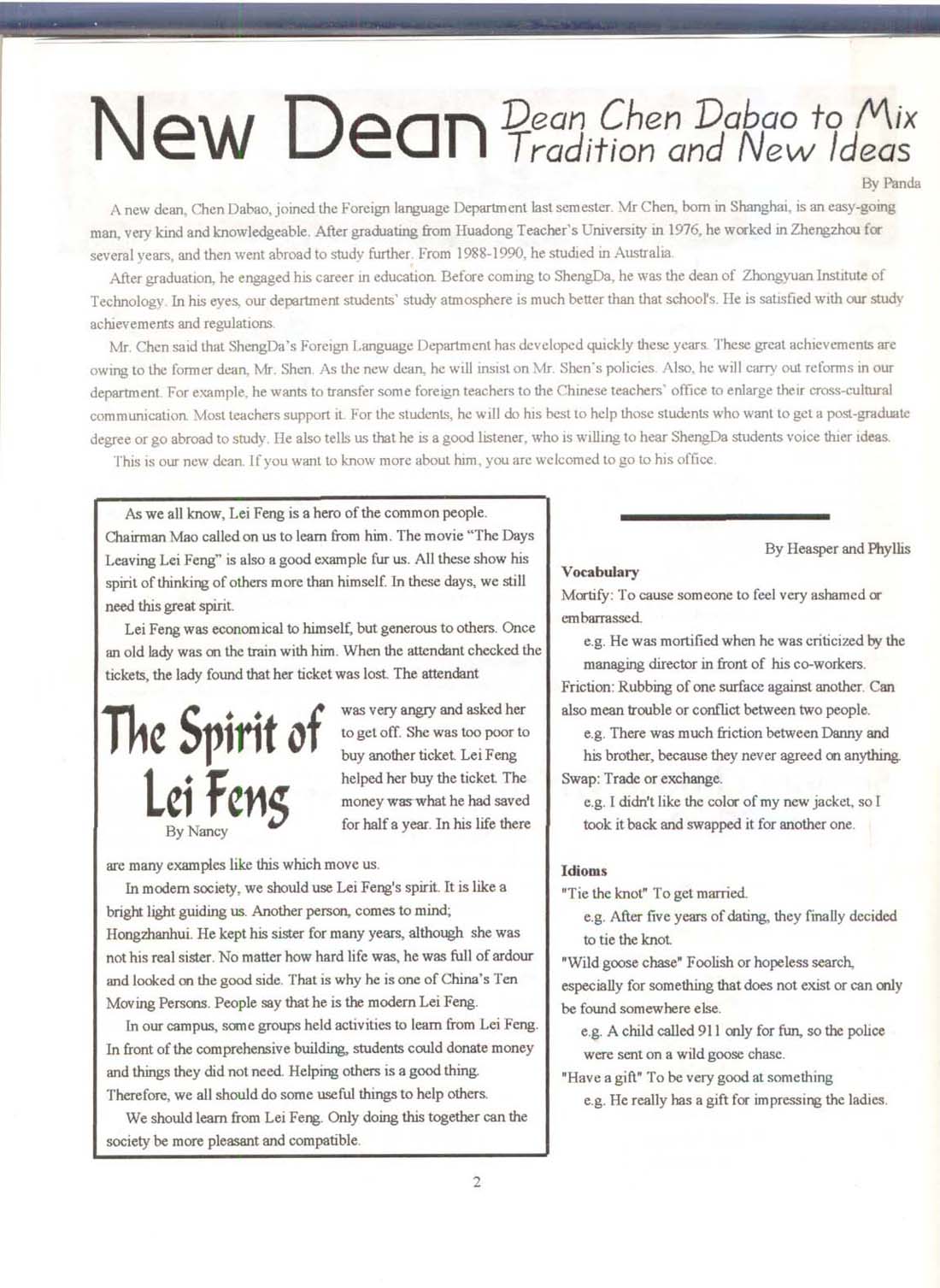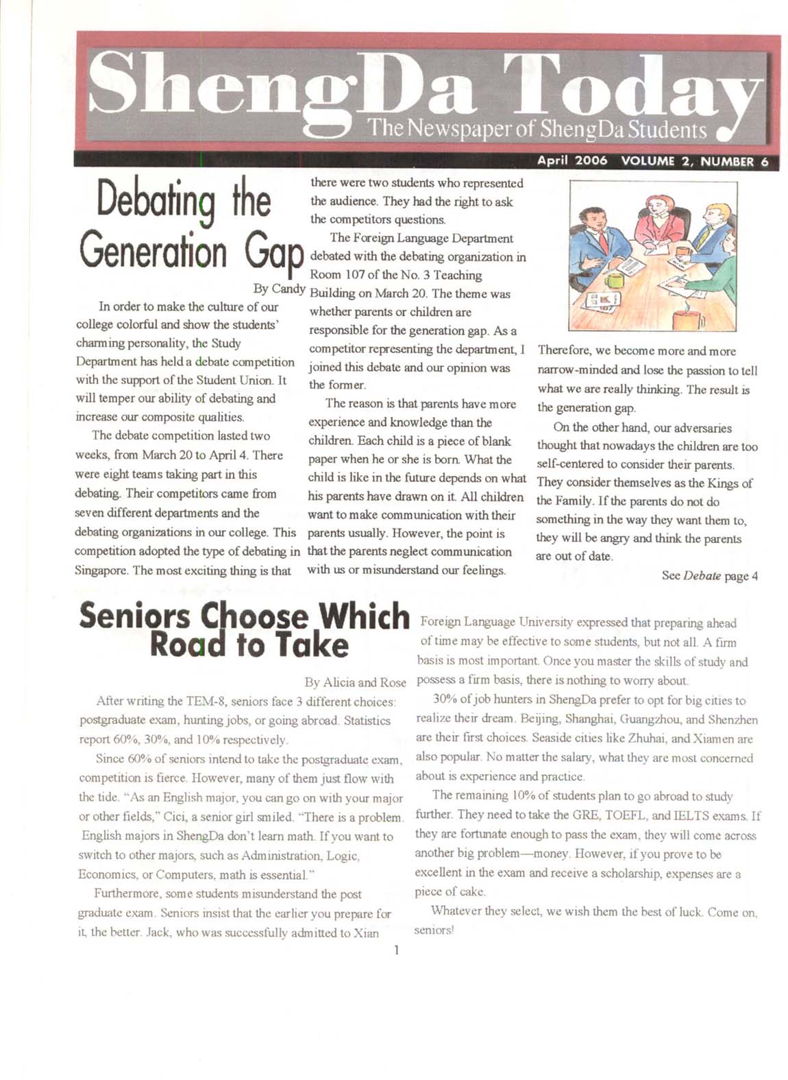 今天第一次与大家正式见面的是2006年4月第6期。本版内容丰富、贴近现实,紧随同学们学习、生活的步伐。有的是分析今年大四毕业生所面临的就业之路,有的是采访去年刚任外国语言文学系系主任的陈大宝副教授,有的涉及时尚的电影《断臂山》,有的讨论了所谓的“代沟”,还有介绍和描述雷锋精神的影响。这些全部由员工组稿,外教Amy、Jay等审稿、编辑。