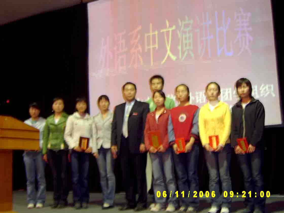 随后,06级团总支书记赵杨老师为本次比赛做了总结和点评。她首先充分肯定了选手的精彩演讲,同时也指出了一些不足之处。最后,比赛结果揭晓:6号选手张帆摘得桂冠。外语系行政秘书杨明志老师,外语系06级团总支书记赵杨老师,外语系员工会副主席苏会青分别为获得一,二,三等奖的选手颁奖并合影留念。