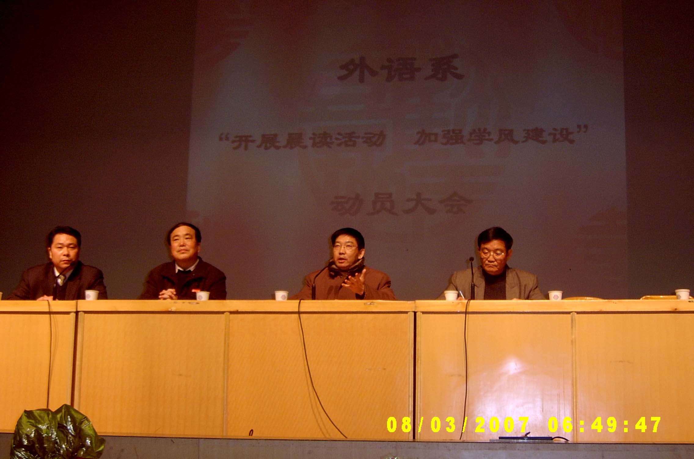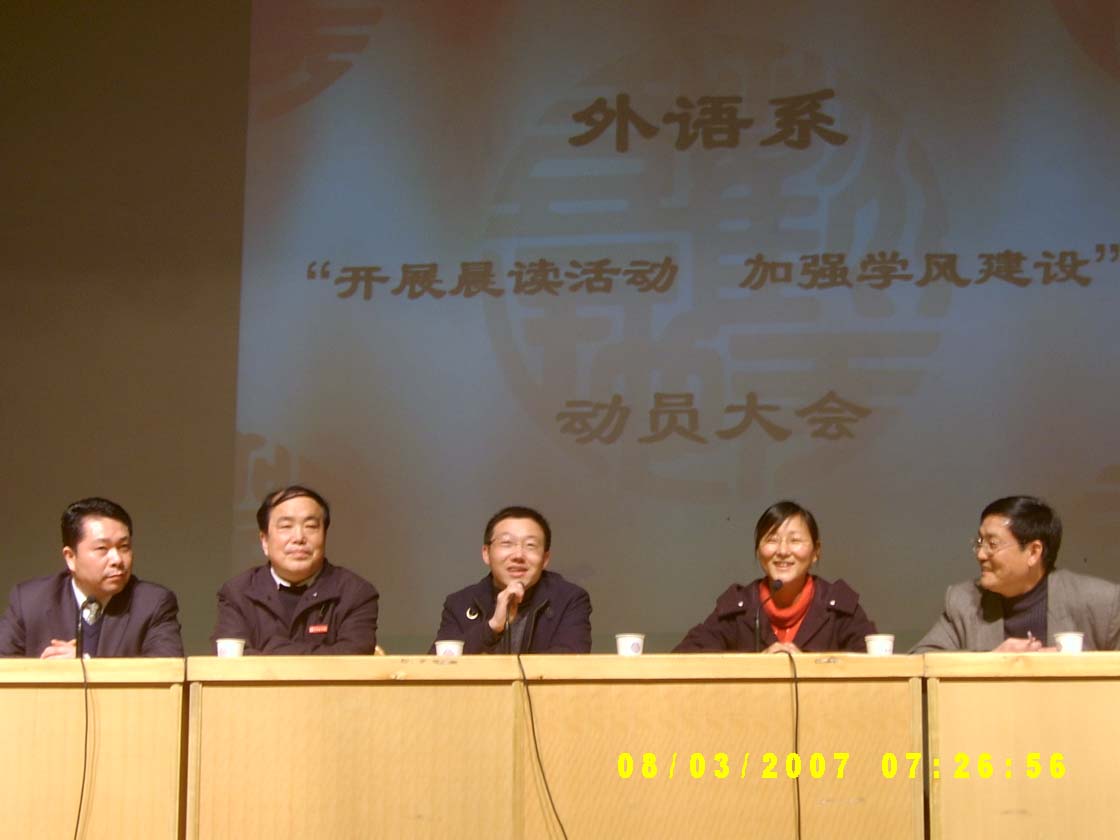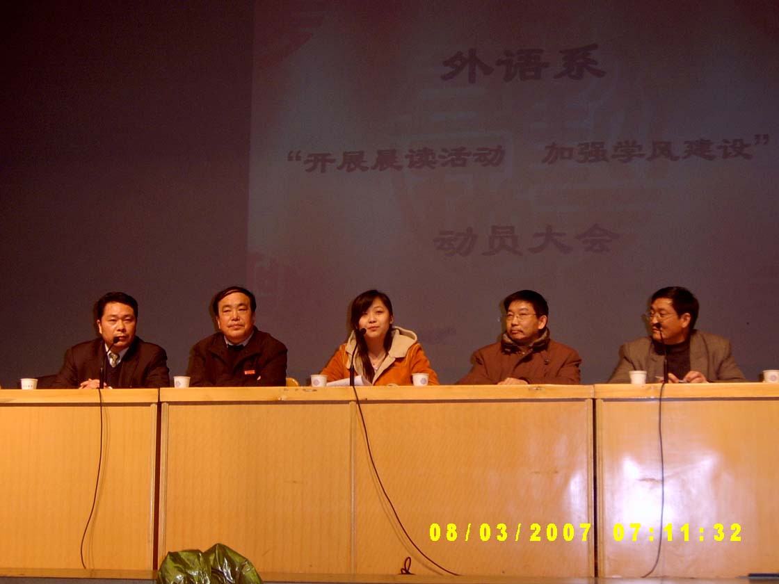 三月八日晚,外语系“开展晨读活动,加强学风建设”的动员大会在灯火通明的思源会馆隆重召开。
