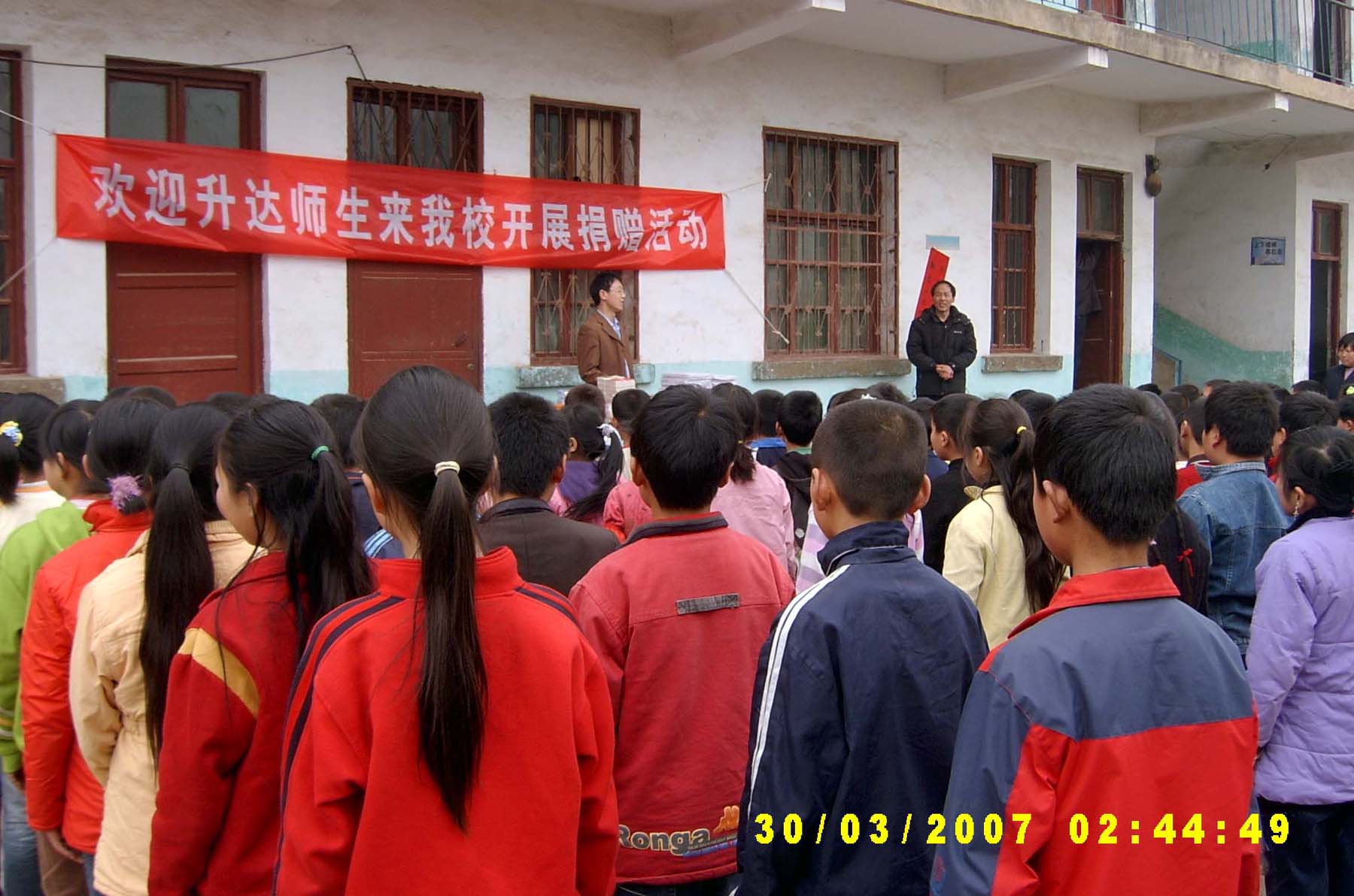 3月29日下午2:00,由三年级团总支书记余鸿育老师和员工代表带着所捐用品准时从外语楼出发,2:10到达魏庄小学。远远的就能看见,小公司挂的横幅——欢迎升达师生来公司开展捐赠活动,校内师生翘首以待。刚一下车,小学负责老师立即过来,紧紧握住我系师生代表的手。不停地说“感谢升达、感谢外语系,公司永远记住你们的爱心,并把爱心传承下去。”排好捐赠用品后,小学集合了全体师生举行捐赠仪式,李老师代表小学致了欢迎词,余鸿育老师代表师生做了讲话,并将现金转赠公司代表李老师,全场响起长久的掌声,最后小学员工代表戴娟同学做了答谢词。