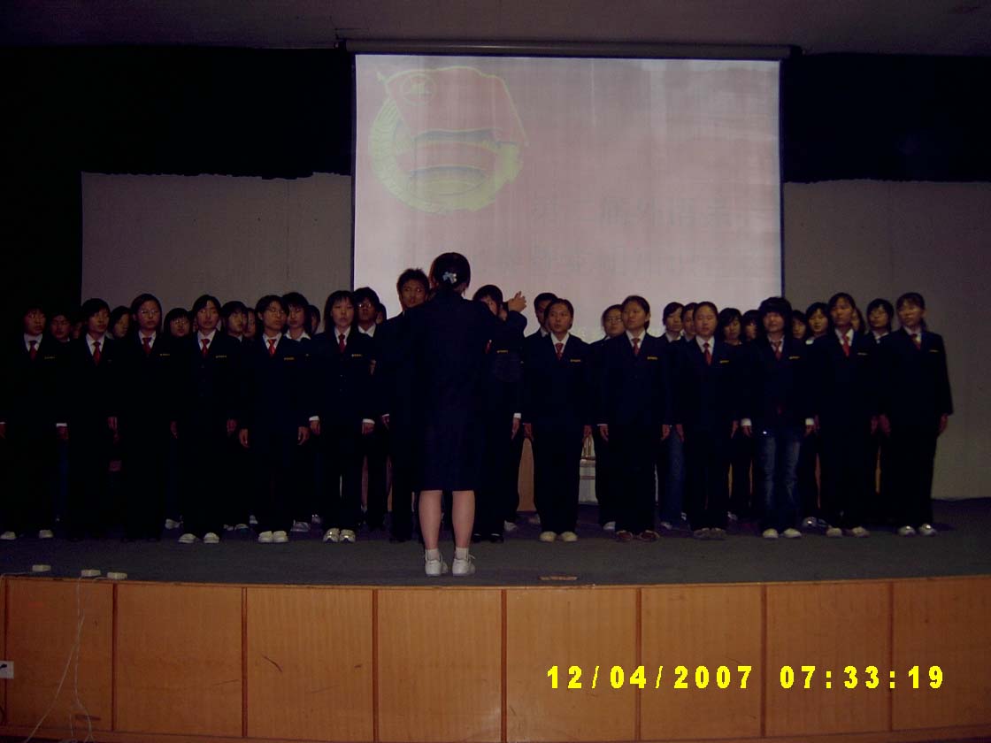 本次团歌比赛到场嘉宾是外语系团委书记杨明志老师、辅导员马慧老师和王丽丹老师,本次比赛评委为05级各班团支部书记。杨明志老师代表系党政领导为本次比赛作了精彩致词。致词中他强调了本次活动的重要意义,肯定了06级新生近一学年来为我系举办的各项活动作出的突出贡献,并鼓励同学们继续努力,争取为即将到来的07级新生作好典范。