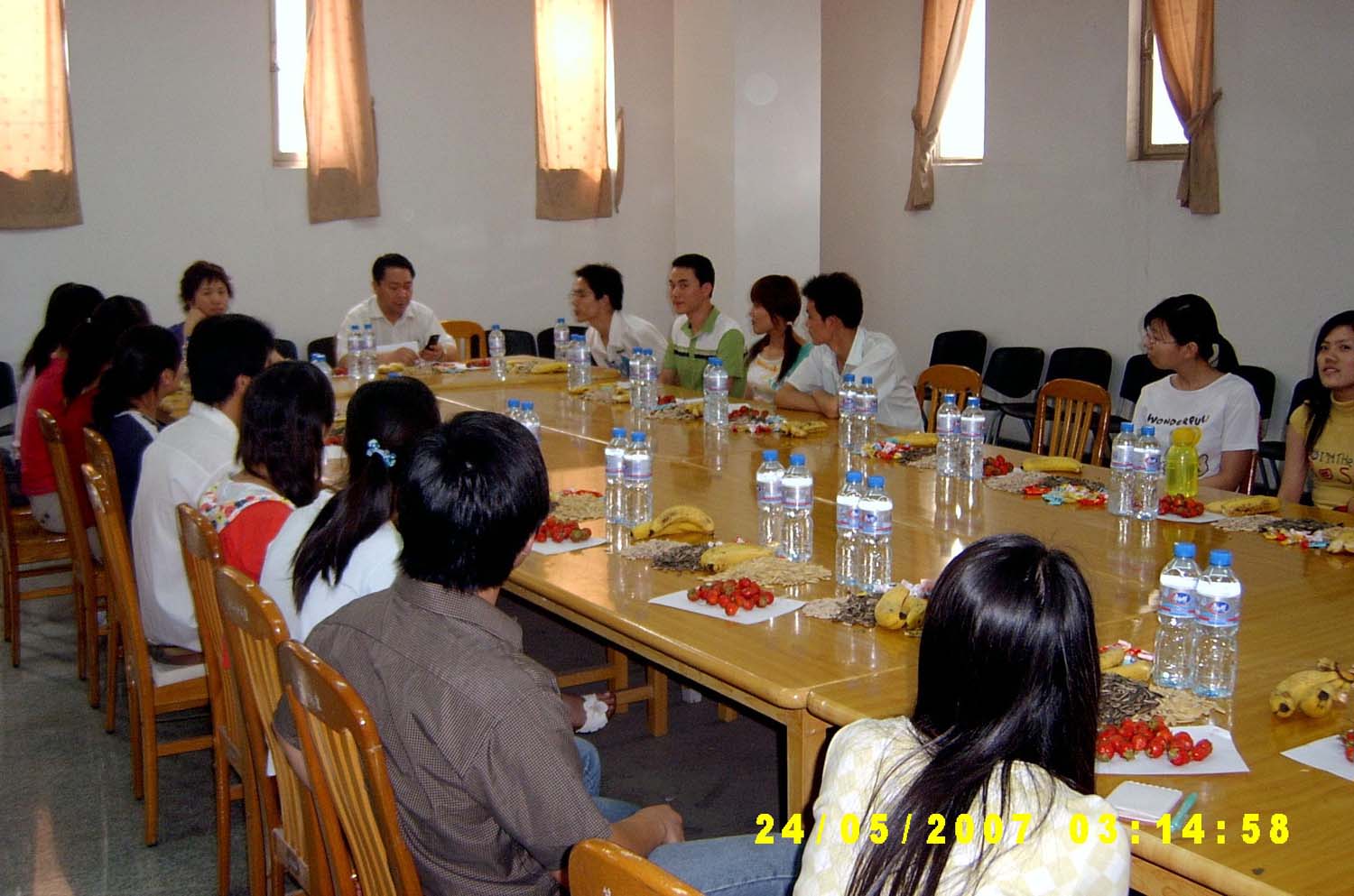 座谈会自始自终充满着温馨的氛围,系领导为参加座谈会的同学们提供了香蕉、草莓、瓜子、糖等,大家在一起边吃边聊,畅所欲言,这温馨的气氛持续了一个多小时,临别时,毕业生们主动给学弟学妹们留下了自己的联系方式,以便以后对他们提供帮助。