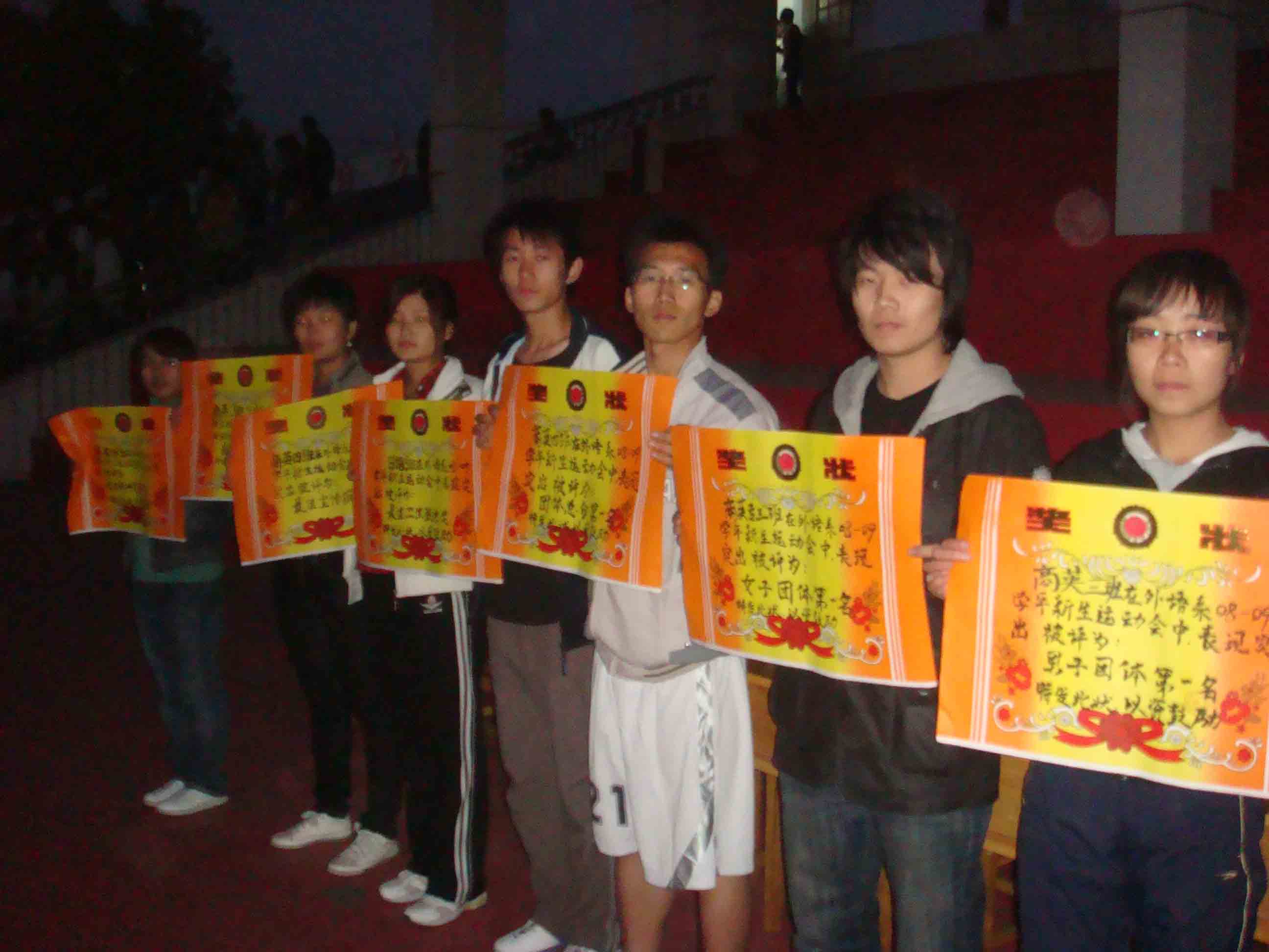 经过激烈角逐,运动会圆满闭幕。商英4班获得“团体总分第一名”和“最佳宣传报道奖”,商英3班获得“男子团体第一名”和“最佳礼仪秩序奖”,商英4班和商英专科3班获得“女子团体第一名奖”,英语2班获得“最佳精神风貌奖”,日语3班获得“最佳卫生整洁奖”。 王娟、贠雯、李恒基等老师出席了闭幕式,并为获奖班级颁奖。
