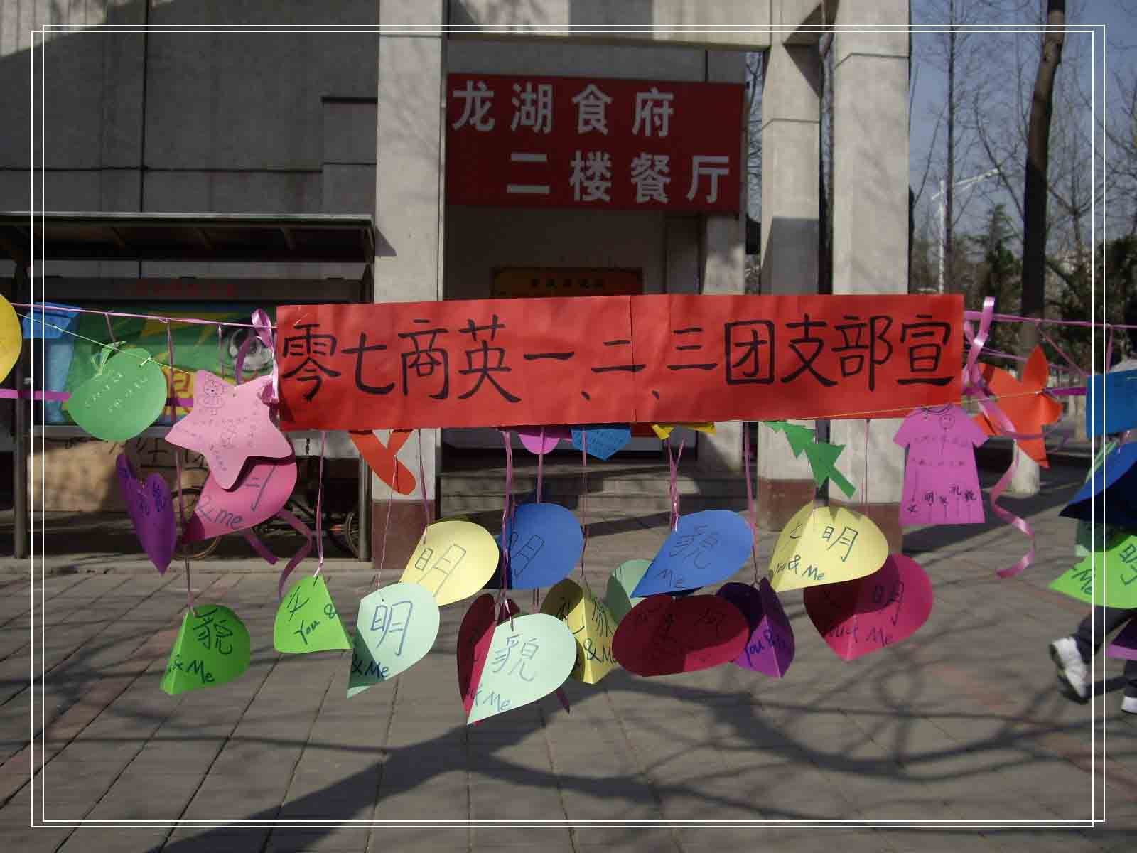 3月19日,2班全体同学在龙湖报告厅楼下和07级商英1班、3班的同学们一道挂起精心制作的爱心小卡片,在每张小卡片上都写着关于文明礼貌的诗歌和名言警句,以期更好的向全院师生宣传文明礼貌。