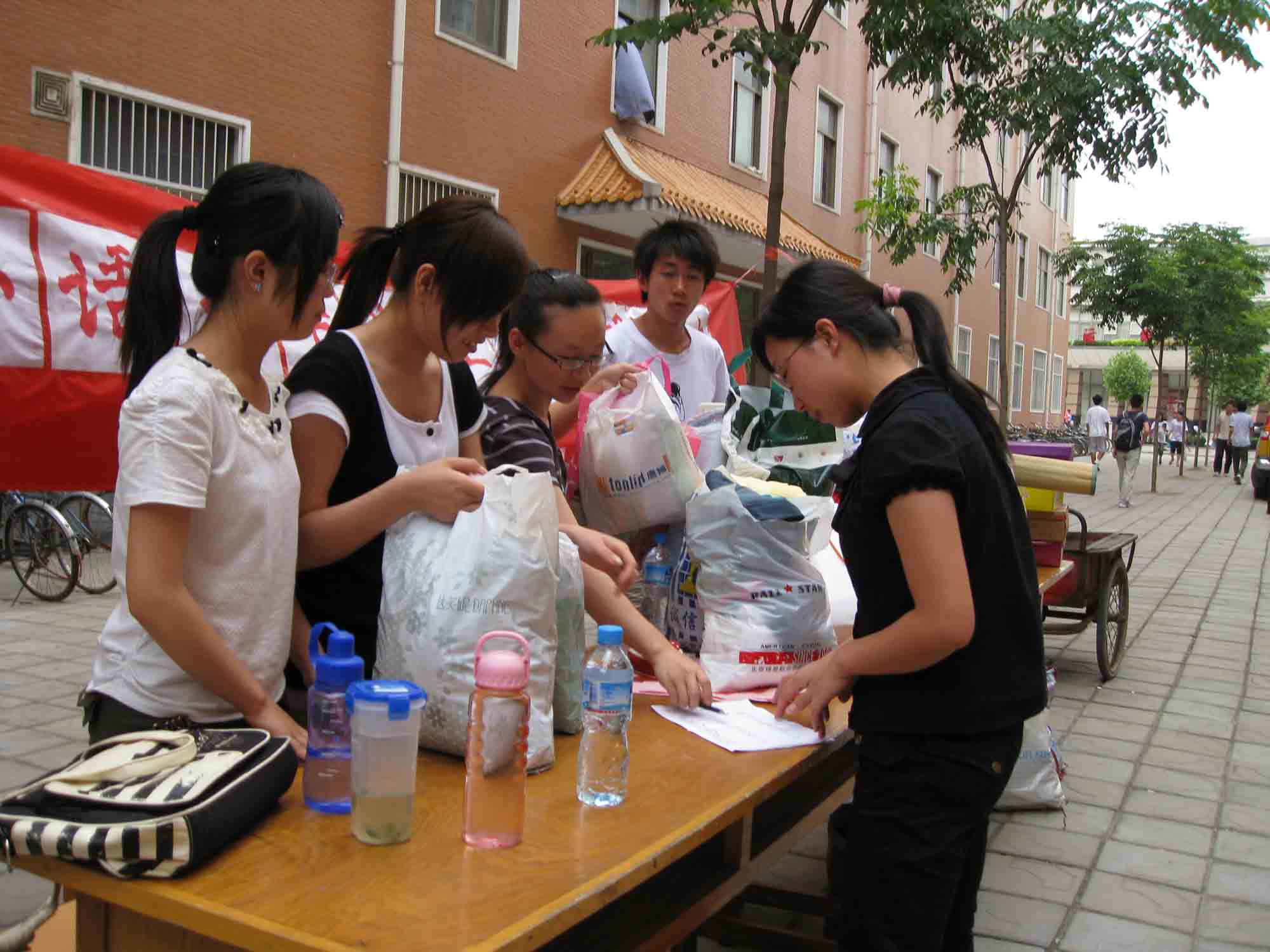 爱心传递活动和送别活动分别同设在宿舍14号楼、16号楼、23号楼前 ,学长学姐们踊跃捐赠,所捐物品多样,不仅有衣服、手包、鞋子、围巾等生活用品,还有教科书、词典、各种杂志等书籍。外语系团学各部门专门组织同学租借三轮车帮助毕业生运送行李。