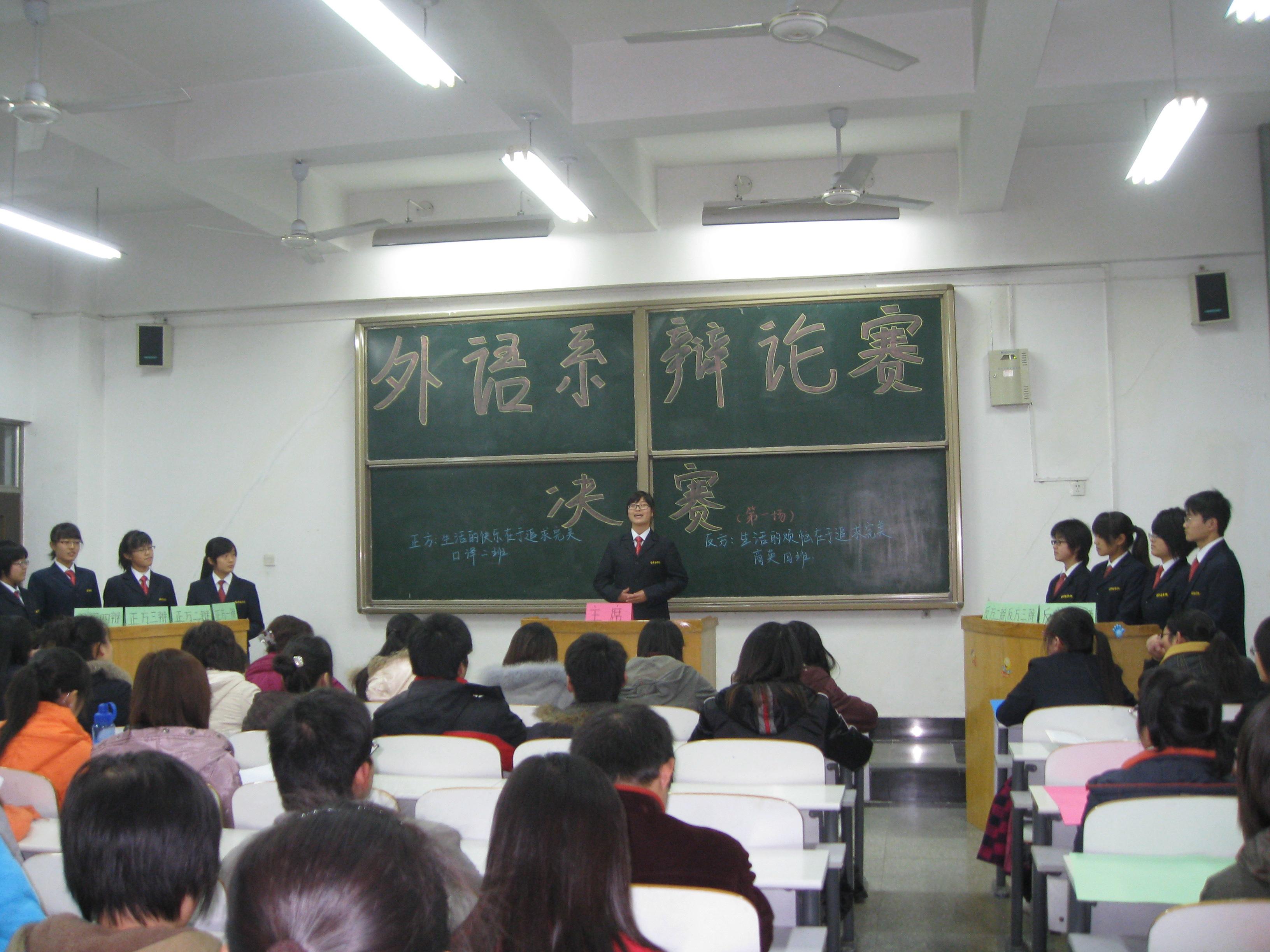 2009年12月1日晚上6:30,在外语楼A座101教室,由外语系学艺部举办的中文辩论赛在历时一个月的初赛、复赛和半决赛后迎来了决赛。本次大赛有幸邀请到的嘉宾有院辩论队队长刘炳明、外语系员工会主席乔羽、外语系员工会副主席王婧和团委副书记付大喜等人。担任本次辩论赛的评委是外语系前任辩论队队长付玉君、前任辩论队主力辩手段奕奕、现任辩论队队长夏金焕、副队长闫慈、周恒等五人。