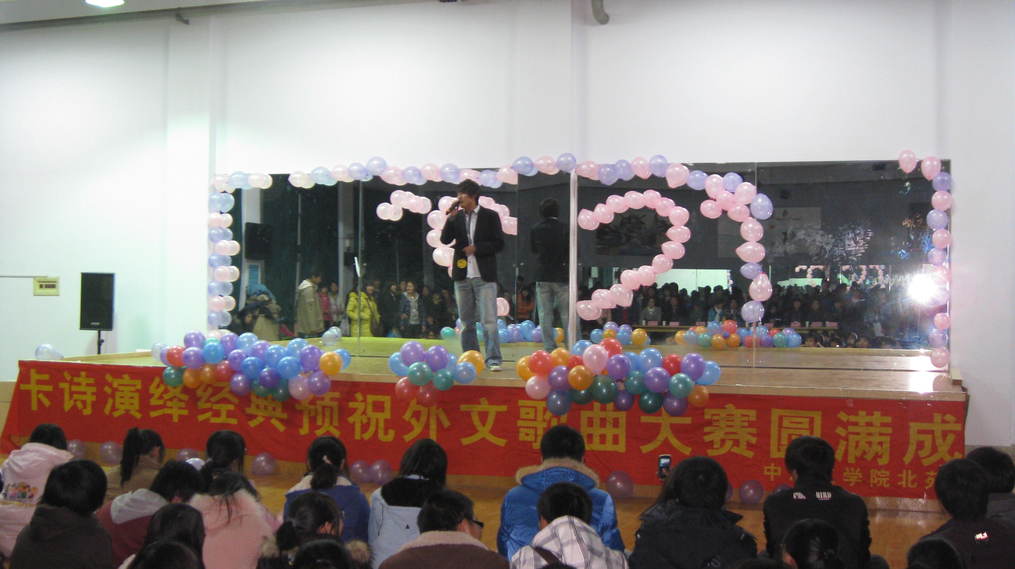 2009年12月21日晚上6:30在体育馆负一楼综合厅,由外语系文艺部举办的面向全校同学的外文歌曲大赛在此隆重举行。担任本次大赛的评委是外教Rico,外语系员工会主席乔羽、艺术系文艺部部长、上届院十佳校园歌手冠军李宇、亚军张芳。