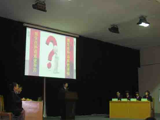 PPT播放结束之后,表演赛正式开始。08级闫慈、吴子婧以及09级张莹、常性慧、乔轶楠、赵一蓓、张泽宇、刘晓慧激烈辩论。辩论现场气氛和谐融洽,节奏紧张而又不失活泼,不时爆发出热烈的掌声。