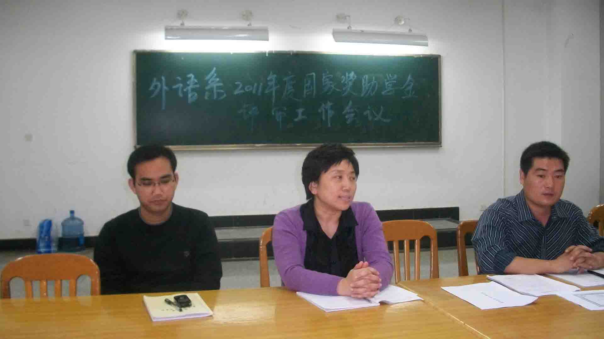 2011年10月11日,外语系2011年度国家奖助学金评审工作会议在外语A楼103会议室如期举行。参加本次会议的人员有党总支书记乔卫同志,全体辅导员老师以及32名员工代表,共计45人参加,会议由副书记石皓召同志主持。