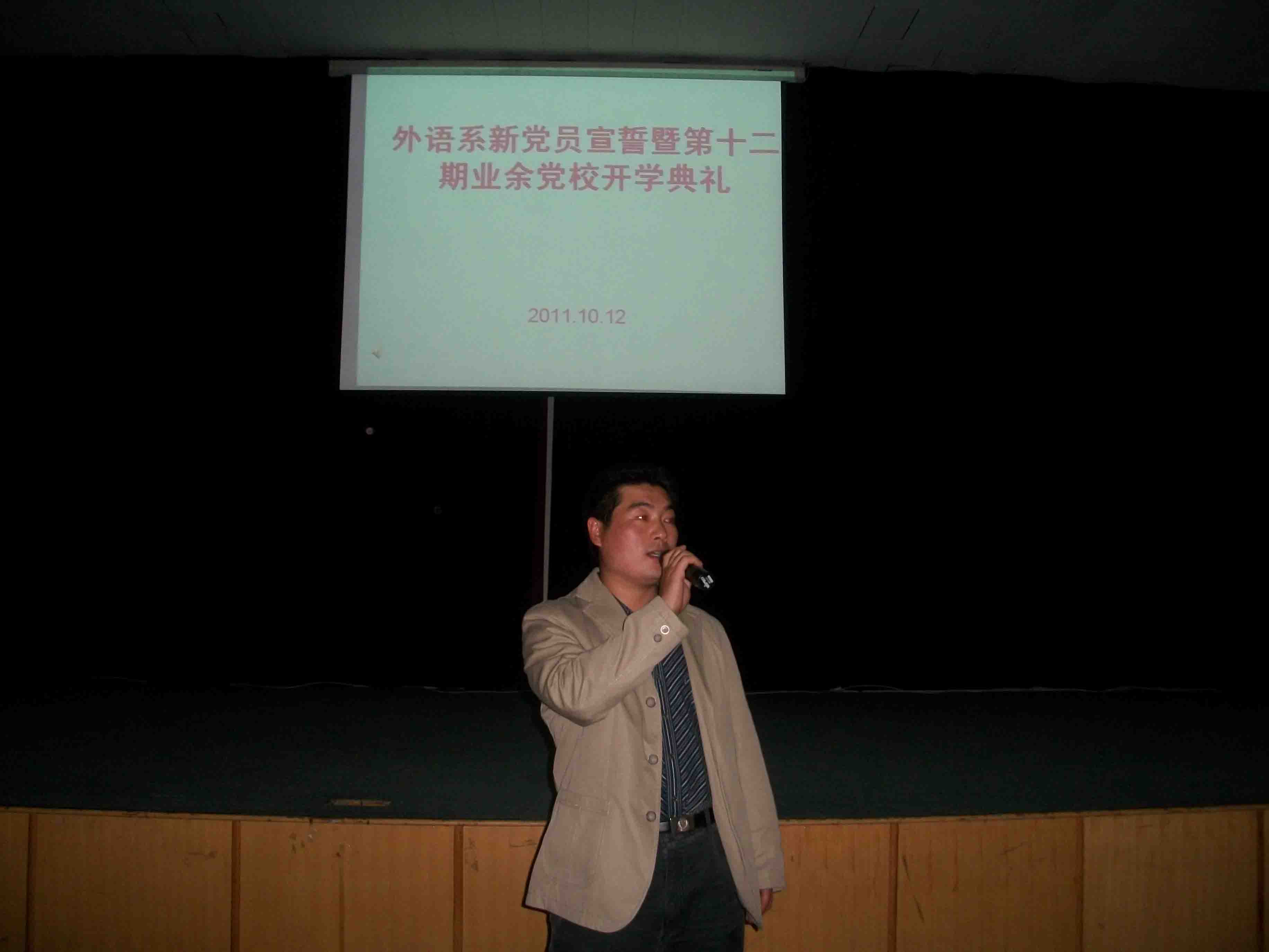 2011年10月13日下午,外语系党总支新党员宣誓暨第十二期业余党校开学典礼在龙湖报告厅隆重举行,外语系党总支副书记石皓召老师,各员工党支部老师及员工党员也参加了此次活动。活动由外语系高建涛老师主持
