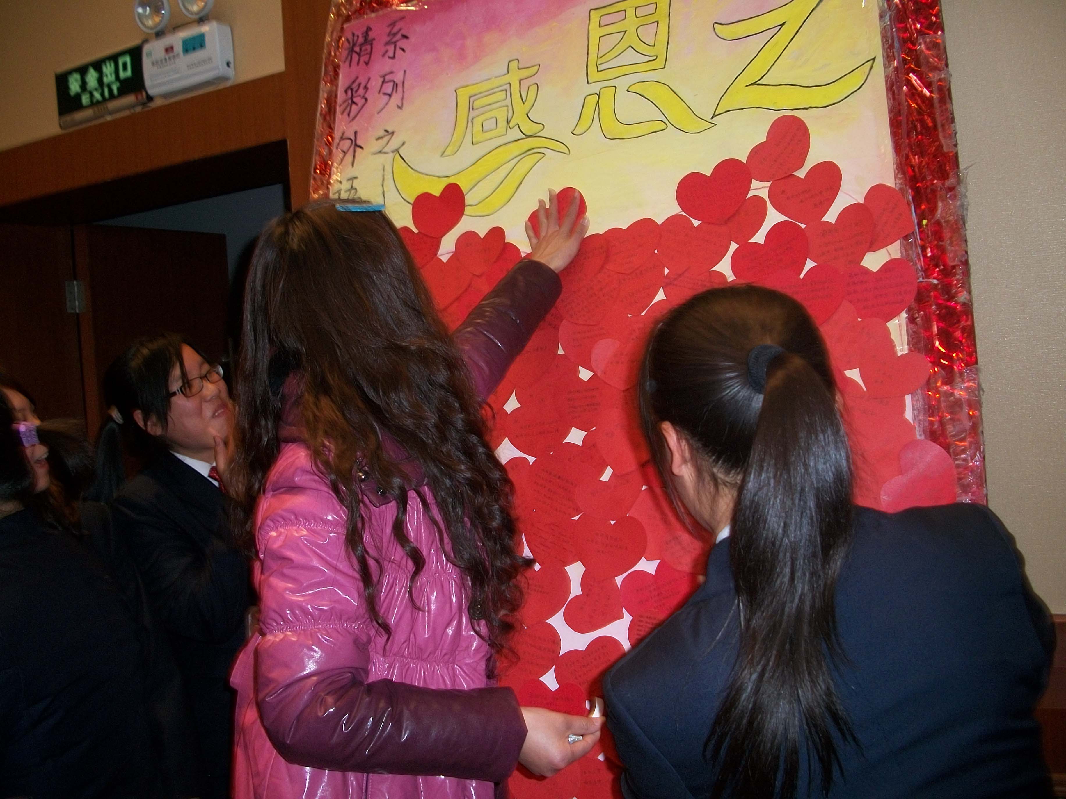 最后,外语系青年志愿者协会的成员为大家表演了话剧、歌曲联唱以及诗歌朗诵等节目,泰山村小学的同学也为大家奉献了精彩的节目《感恩的心》,把宣讲会气氛推向了高潮。宣讲会结束后,与会领导与全体观众纷纷起身,将感恩之心的卡片贴在感恩板上,将感恩精神永远传递。
