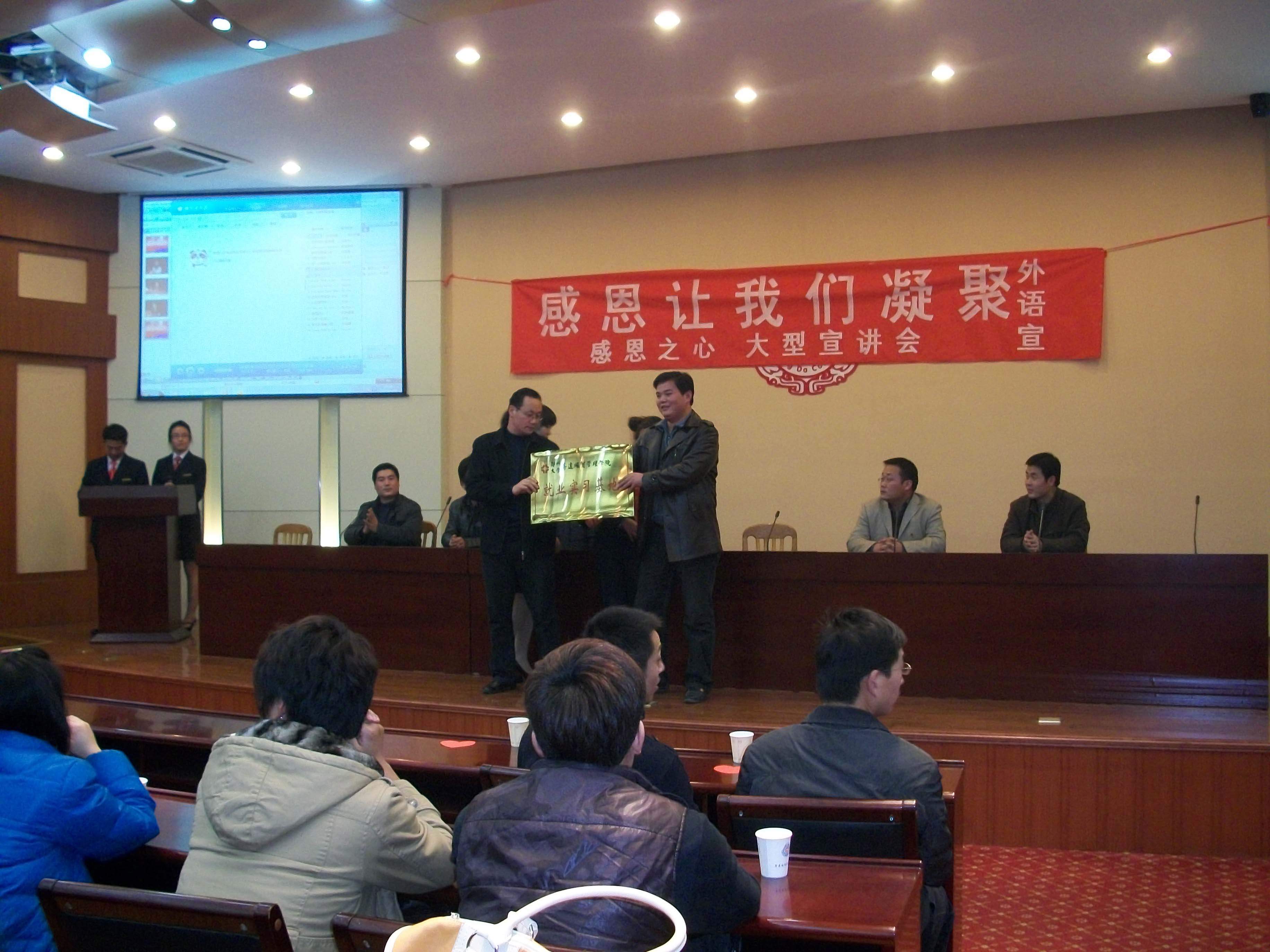 宣讲会伊始,院团委王红晓书记做了讲话,他充分肯定了外语系青年志愿者所取得的成绩,并号召全院青年员工行动起来,加入到志愿服务者的行列当中,为社会的发展做出贡献。胡张伟董事长也为大会致辞,他首先对外语系青年志愿者系列支教活动表示感谢,并欢迎更多得升达学子加入到这个队伍当中,帮助泰山村希望小学教学工作的开展。为更好的传承这一活动,也为了继续发扬青年志愿者精神,外语系与泰山村建立了长久的合作关系,并在泰山村希望小学建立了就业实践基地,院办朱永恒主任代表公司向泰山村希望小学授予升达公司就业实践基地的匾额。