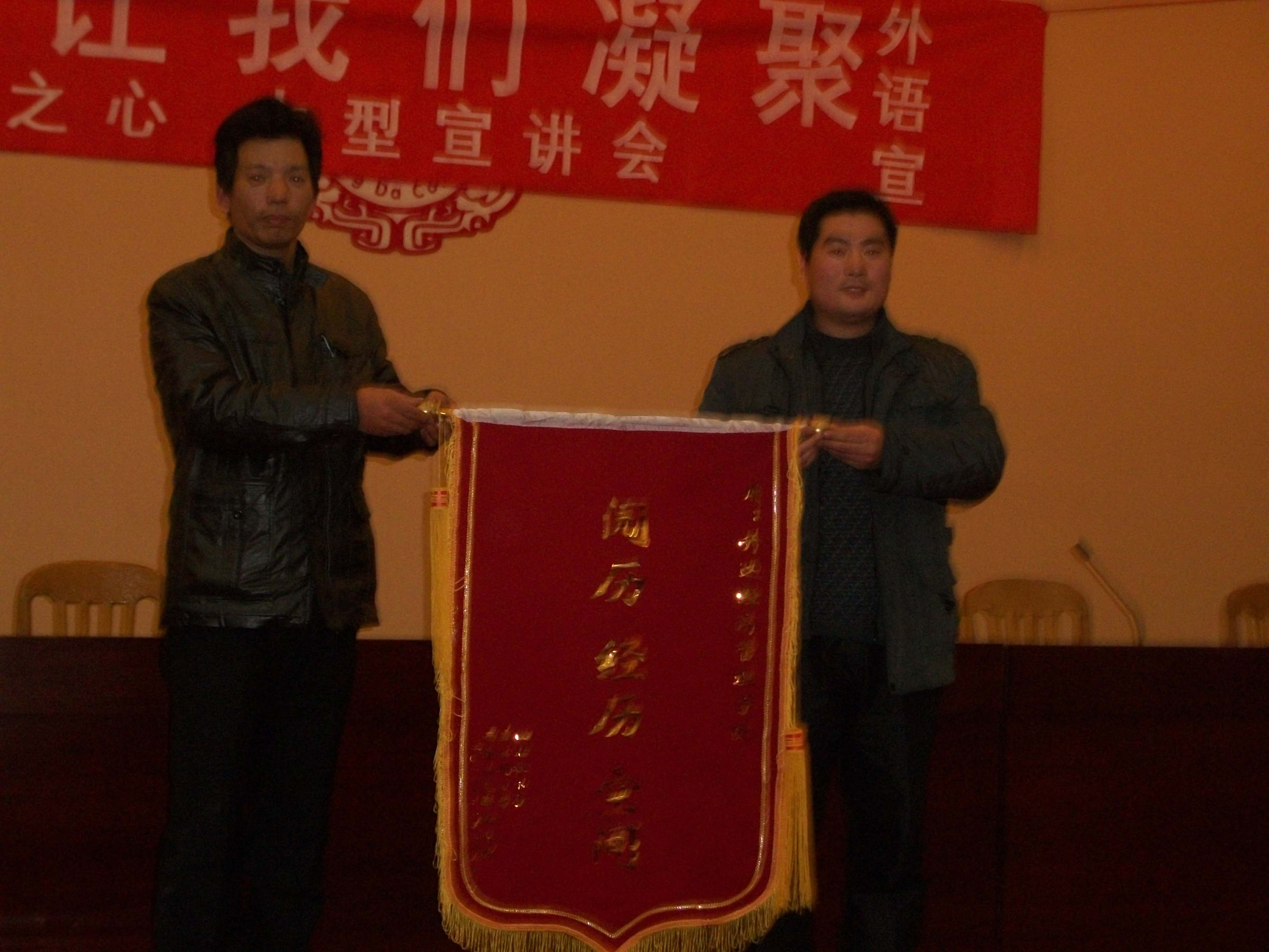 泰山村文化宣传负责人乔子军老师也代表泰山村发表热情洋溢的讲话,并向公司赠送了题写为“阅历 经历 空间”的锦旗。外语系青年志愿者代表上台开展了宣誓活动,并由院团委王红晓书记向他们授予“青年志愿者”旗。泰山村希望小学的四名员工代表也为10名优秀支教选手颁发了荣誉证书。