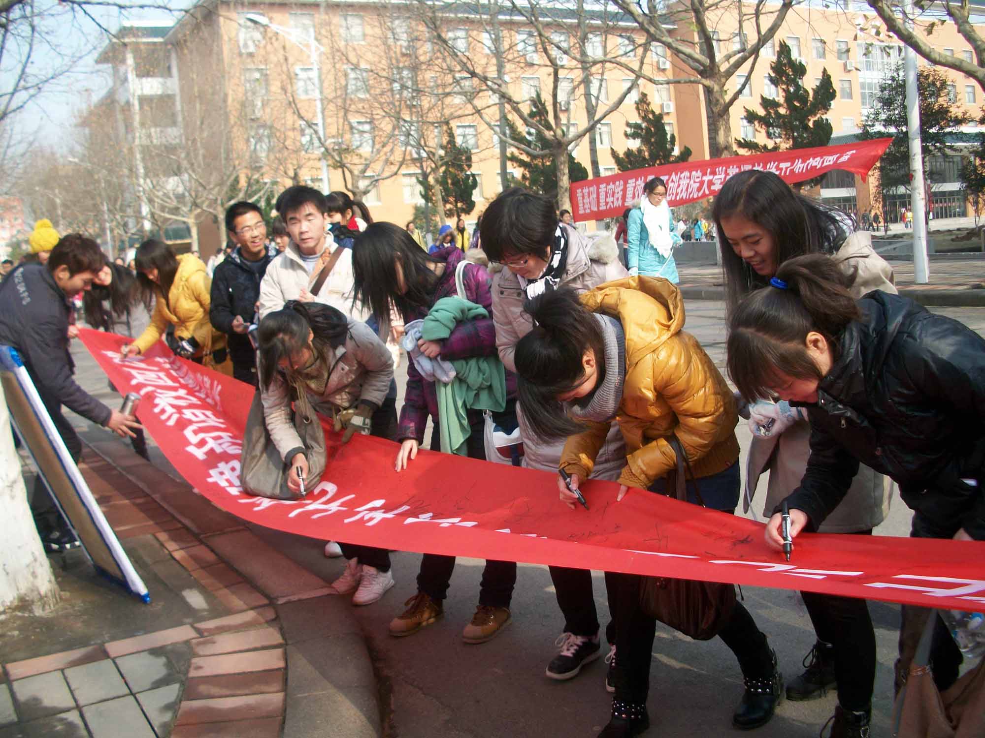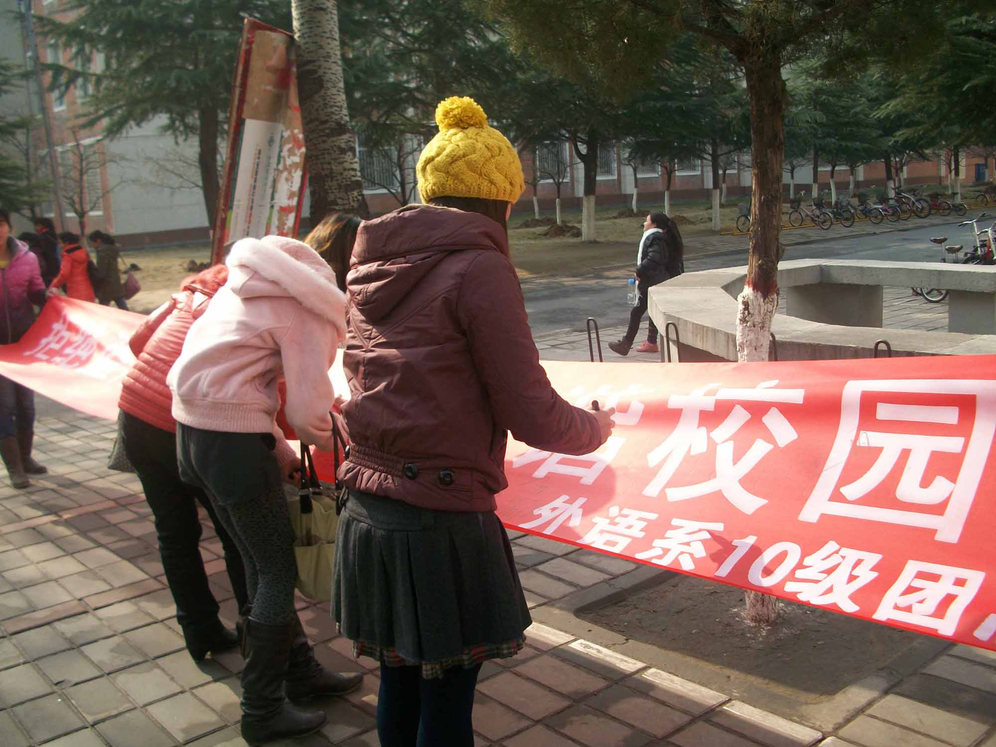 12月8日中午,由外语系10级团总支主办的“拒绝盗版教材,创建和谐校园风”签名活动在外语楼前举行。