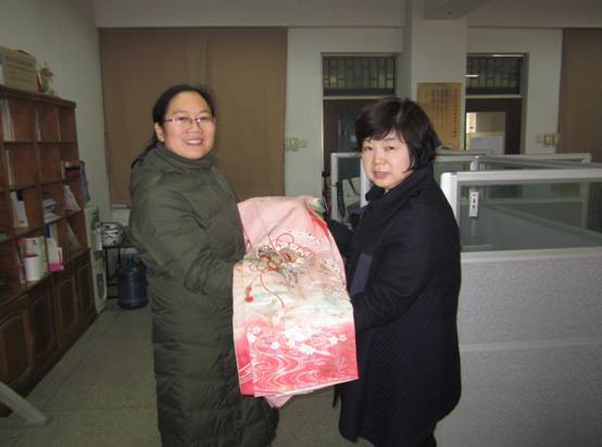 由于一些客观原因,山形老师只为公司服务一个学期。在仅有的一个学期里,山形老师除了教授日语专业三年级两门专业课以外,几乎把所有休息时间都奉献给了员工。山形老师曾专门修过茶道,在山形老师几个月的悉心指导下,12月2日下午三年级员工在日本文化室成功举办了面向全系员工的中日抹茶交流会。没想到在即将离职之际,山形老师又为日语专业捐赠如此精美贵重的振袖和服,这着实让人感动。