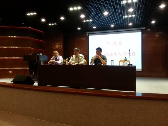 为了使177名2014级外语系新生树立信心,确定目标,尽快适应老员工活,在各专业教育的基础上,9月26日上午9点30分,外语系在外语楼A座多功能厅为2014级本科新生进行了入学教育,系主任马秉义教授,系党总支石皓召副书记,教学秘书王璨老师,行政秘书兼团委书记惠凯赟老师,以及优秀员工王崇波老师参加了本次活动。活动由教学秘书王璨老师主持。