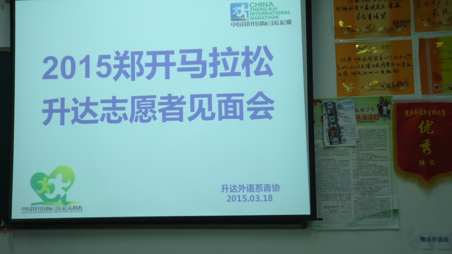 3月18日晚,在时金楼111由外语系青志协主办的郑开马拉松志愿者见面会拉开帷幕,通过海选、复试和面试的层层选拔,76名来自全院各系各专业的同学成为本次郑开国际马拉松比赛升达站的志愿者。