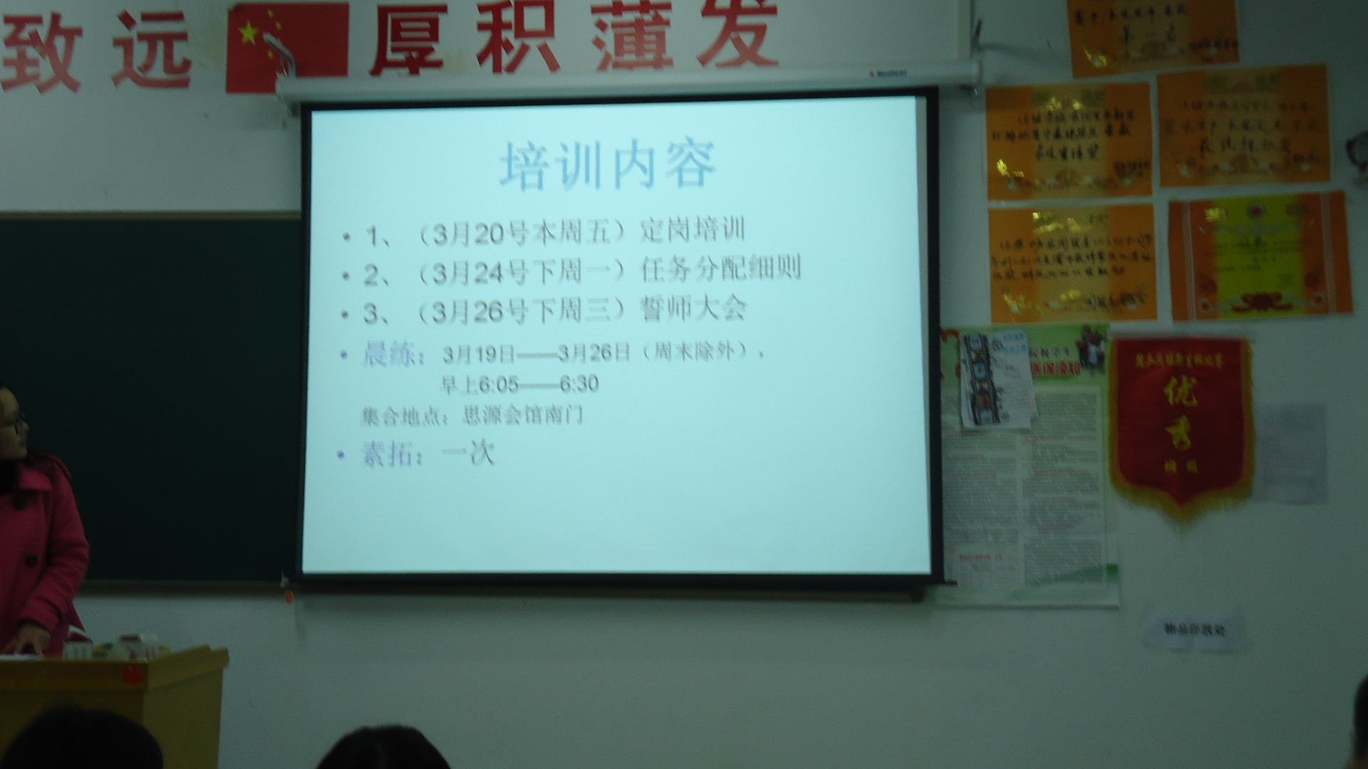见面会分为三个环节,首先,进行了志愿者分组,共分为了七组,每队由队长副队长及八个队员组成。组内人员在短时间内相互熟悉,制定本组口号,明确工作宗旨,并且进行了人员分工。组内人员迅速达成共识,本着“服务至上”的态度,展现出一个志愿者应有的热情,做一个耐心,周道,体贴的志愿者。其次介绍了志愿者培训的相关内容,除了下周一至周三每天早晨6:05分在思源会馆南门集合开展的体能训练,还给大家介绍了定岗培训、任务分配等相关内容。最后强调了纪律问题,要求志愿者严肃对待每次训练机会,拿出严谨的态度与负责的精神。