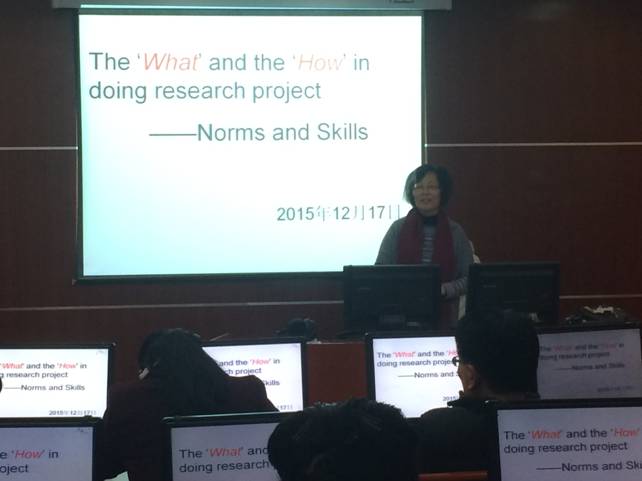 随后,赵文静教授为外语系全体教师,做了题为“The ‘What’ and the ‘How’ in doing research project -- Norms and Skills”的专题学术讲座,以多种角色,从不同角度审视学术研究。赵教授结合自己做项目的心得以及作为项目评审专家的经验,向外语系教师介绍了申请课题应注意的各个方面。她强调,选题应选自己感兴趣的领域,根据个人学识基础并结合自身优势,选择能可持续研究的主题;随后,她又为在场的老师演示了检索文献的具体操作方法;并通过举实例分析讲解了如何细化题目、找研究问题以及格式和参考文献方面的注意事项;