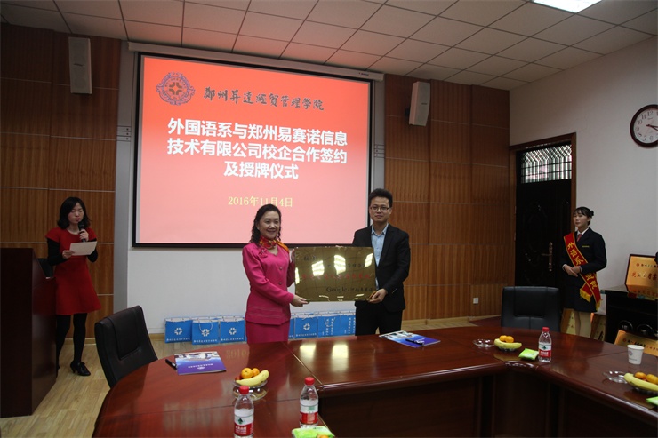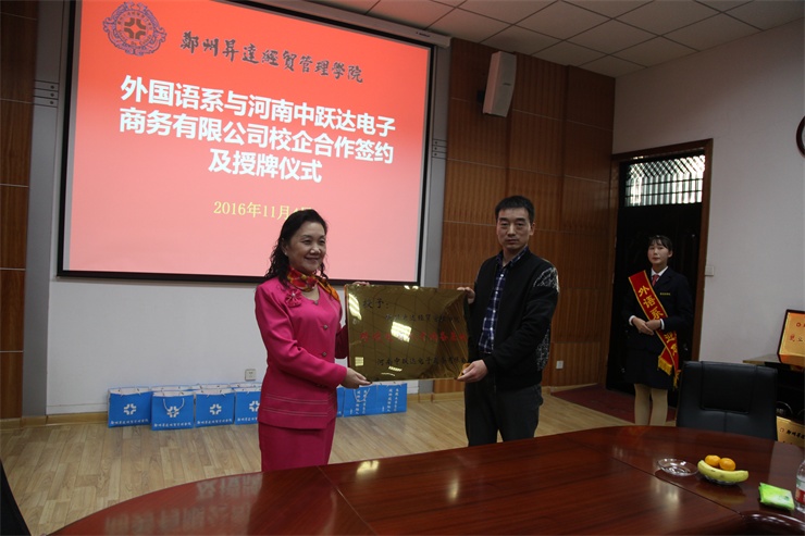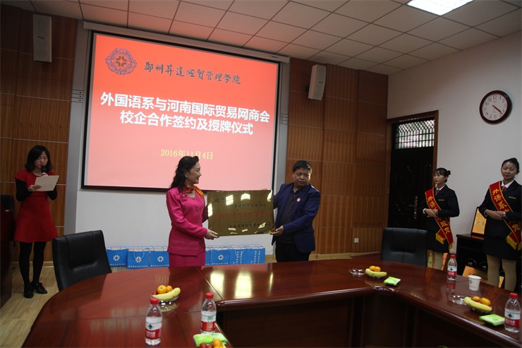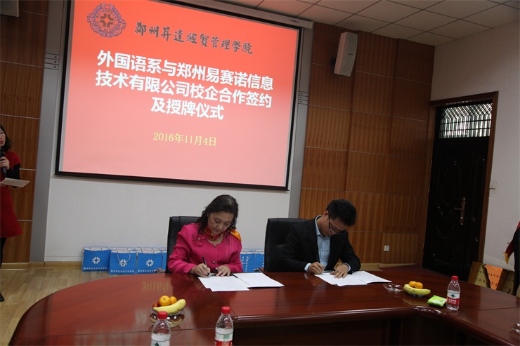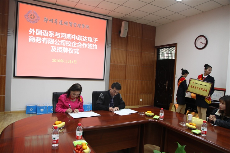 2016年11月4日下午,在公司第二会议室,外国语系隆重举行“彭川勇跨境电商实训室”暨校企合作签约仪式,接受2004届优秀员工彭川勇为母校捐建的跨境电商实训室,并与上海派道网络科技有限公司、河南中跃达电子商务有限公司、郑州易赛诺信息科技有限公司、河南省国际贸易网商协会等四家企业和协会签署校企合作协议,共同致力于跨境电商人才的培养。经理郭爱先教授、住校董事王新奇先生、发展规划处兼校地合作处沈定军处长、外国语系主任张梦教授、系党总支书记石皓召同志出席签约仪式,仪式由外国语系副主任崔瑾英副教授主持。