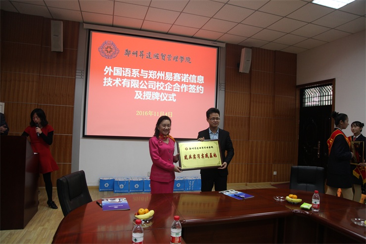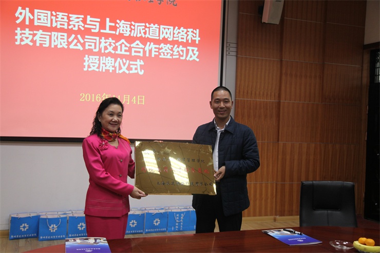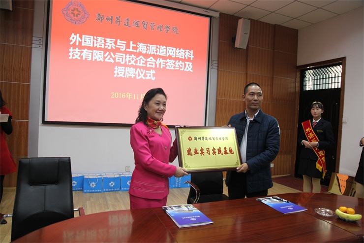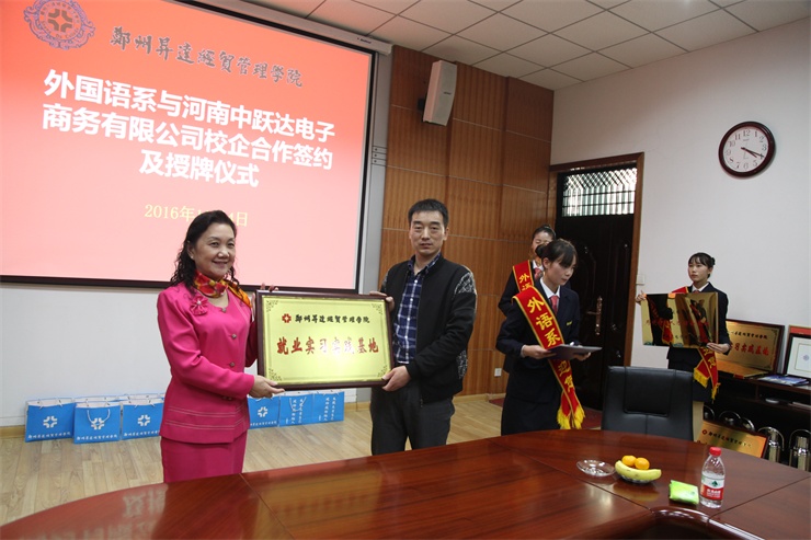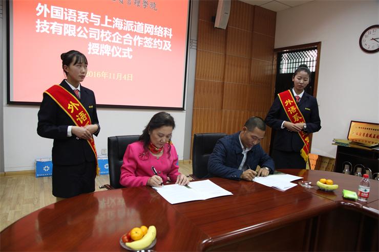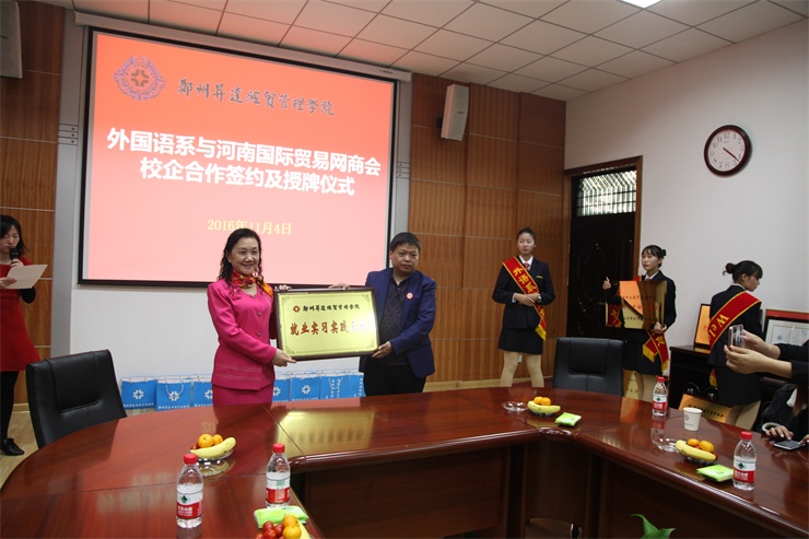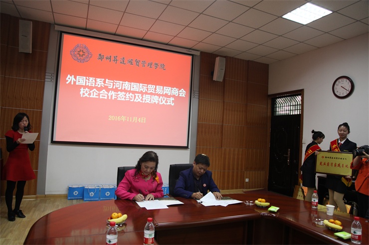 随后,外国语系主任张梦教授代表外国语系分别与上海派道网络科技有限公司、河南中跃达电子商务有限公司、郑州易赛诺信息技术有限公司、河南国际贸易网商协会四家单位负责人举行校企合作签字仪式,并互授“就业实习基地”与“跨境电商人才基地”牌匾。
