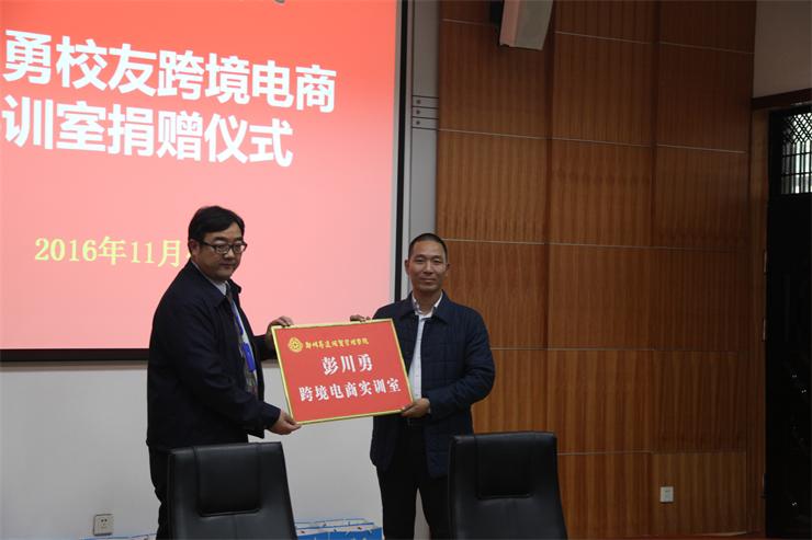 在签约仪式开始前,首先举行了“彭川勇跨境电商实训室”捐赠仪式。“彭川勇跨境电商实训室”是由外国语系2004届优秀员工彭川勇个人出资捐建的,实训室由商务谈判室和实训工作室两部分组成,实训工作室内配置32台电脑及32套办公桌椅,并配有投影仪、音箱等音视频设备,以方便教师课堂讲授及员工具体操作。商务谈判室内按商务公司标准配置,为员工提供真实的商务谈判环境。实训室为全体商务英语专业员工提供真实的跨境外贸工作环境,理论培训环节由彭川勇员工所创立的外贸公司按照企业的员工培训标准流程开展,实训环节则以彭川勇员工公司内实际外贸业务标准流程开展。实训室致力于国际贸易的具体操作和应用培训及未来电商企业的孵化和培植,通过实训,确保在员工走出校门前具备胜任跨境贸易业务工作的能力,并后继跟踪孵化培植出一批跨境电商企业。公司执行董事王新奇先生代表公司接受了捐赠并为彭川勇员工颁发了“员工贡献奖”。