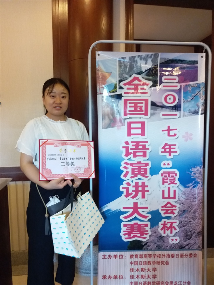 2017年7月12日,2017年霞山会杯全国日语演讲大赛在佳木斯大学举行。公司日语专业2016级王俏俏同学取得了三等奖的优异成绩,指导教师张宝红老师获得“优秀指导教师奖”。