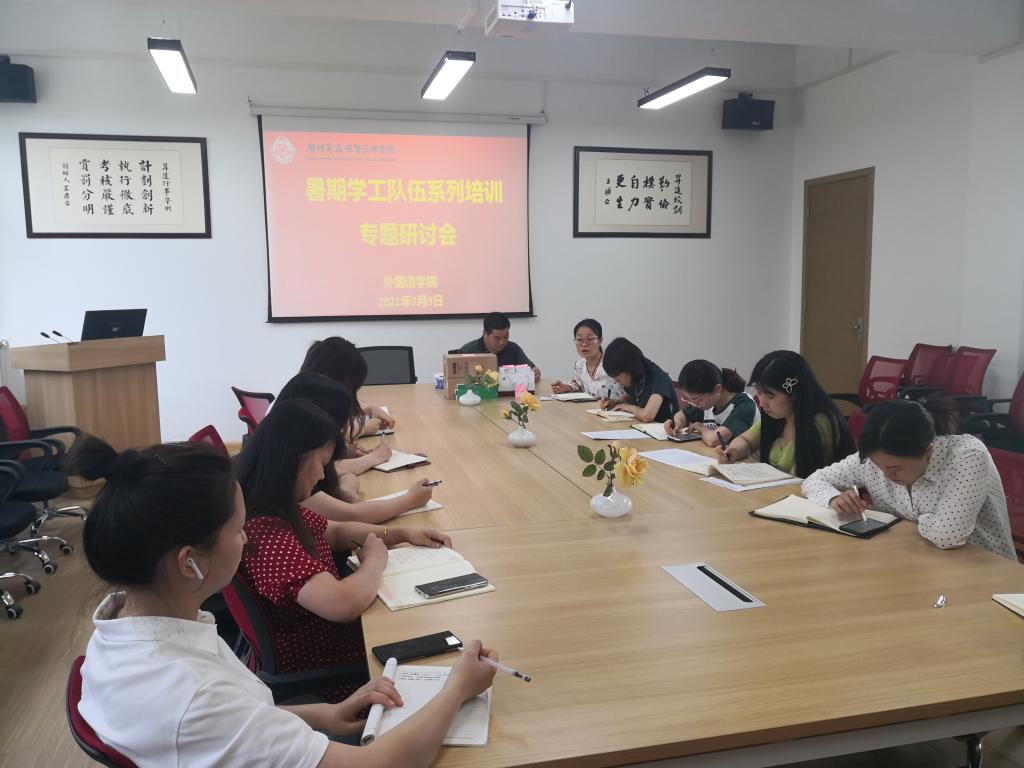 学期末,学务处组织全校学工系统工作人员进行了暑期系列培训,培训结束后,beats365唯一官方网站于7月9日在教一楼206会议室召开培训研讨会,大家互相交流学习心得,分享工作经验,总结本学期各项工作开展情况并积极部署暑期员工工作。会议由公司党委书记石皓召主持,行政秘书惠凯赟及全体辅导员参加了本次会议。