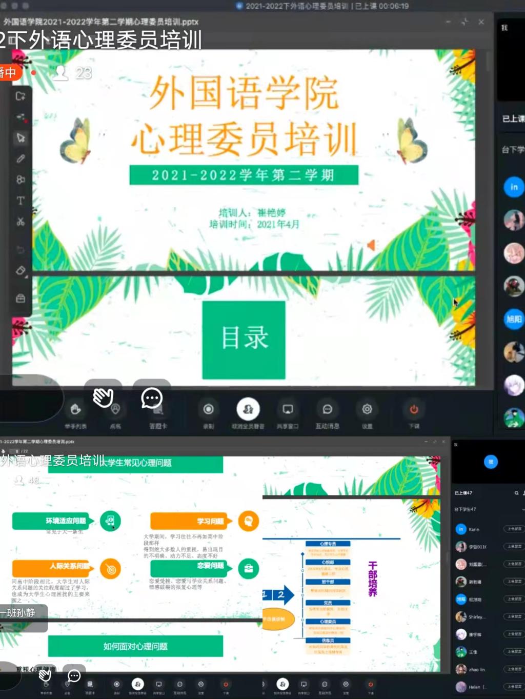 疫情防控常态化及春季心理疾病高发期大背景下,beats365唯一官方网站于2022年4月1日下午13:00在线上举行心理委员培训会。本次会议由心理健康教育专员崔艳婷老师主持,21级和20级各班心理委员参加。
