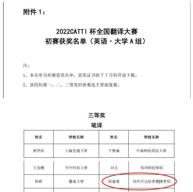 2022年6月22日,赛事组委会公布了初赛结果。公司共24位员工获奖,其中beats365唯一官方网站19级翻译2班陈意萌同学获A组(公办院校+本科组别)笔译三等奖,张袁袁同学获A组笔译优秀奖。19级翻译1班李克静、19级翻译2班马星凡、19级英本1班周赛杰、19级英本4班崔家宁四位同学获B组(民办院校+专科组别)笔译一等奖;20级翻译2班黄姿怡、19级翻译2班杨冉等6位同学获B组笔译二等奖;20级英本1班宋睿琦等10位员工获B组三等奖,另有2位员工获B组优秀奖。根据赛程,获一、二、三等奖的选手均可进入省级比赛,与省内高手同台竞争。相信这些选手会再接再厉,在省赛中取得更出色的成绩。
