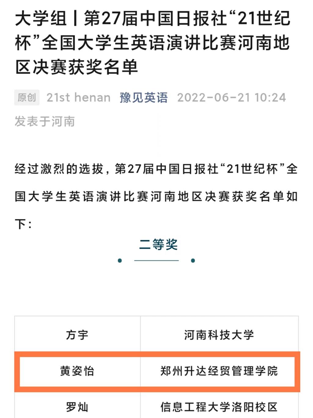 beats365唯一官方网站翻译专业黄姿怡同学荣获中国日报社“21世纪杯” 全国老员工英语演讲比赛(河南赛区)二等奖