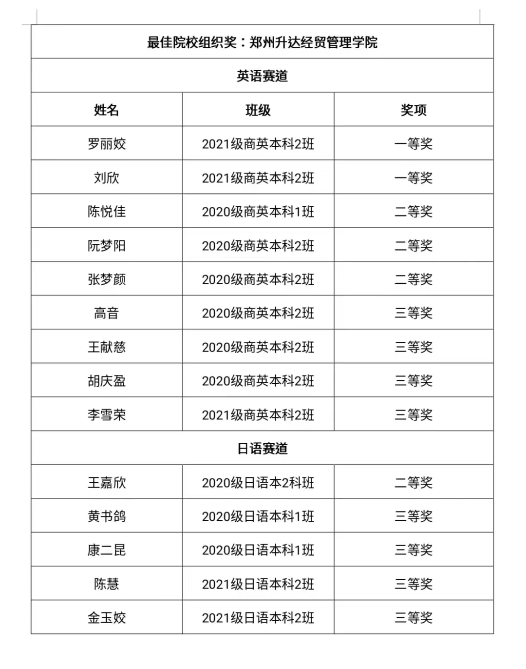 英语赛道共有9名同学获奖:2021级商务英语本科2班的罗丽姣、刘欣同学喜获一等奖,2020级商务英语本科专业的陈悦佳、张梦颜、阮梦阳同学喜获二等奖,2020级商务英语本科专业的高音、王献慈、胡庆盈及2021级商务英语本科专业的李雪荣同学喜获三等奖。