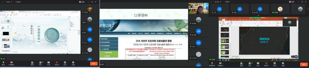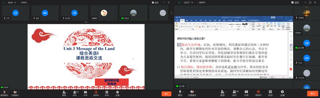 2022年11月14日下午16时,在张艳波主任的组织下,翻译教研室召开了本学期课程思政交流分享会。因疫情原因,会议通过钉钉会议线上举行,翻译教研室全体教师参加。