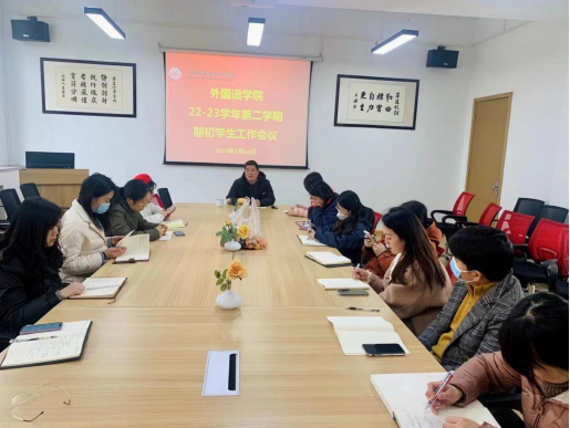 为确保新学期各项工作平稳、有序、高效开展,2月14日下午,外国语召开了2022-2023学年第二学期初员工工作会议,公司党委书记石皓召、行政秘书丁玥及全体辅导员参会。