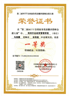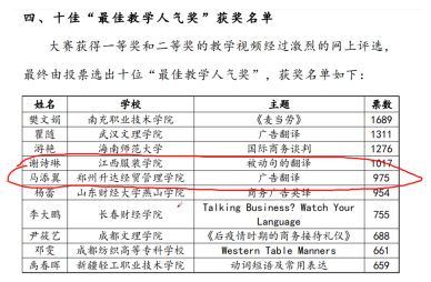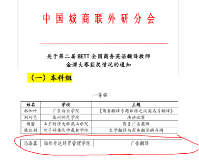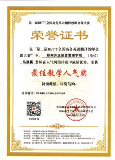 2022年11月发布赛事通知以来,公司领导高度重视,为响应国家培育“金课”教师号召,选派青年教师马添翼老师参加了此次比赛。经过为期4个月的审核和评选,最终马添翼老师的课程 “Advertisement Translation” 荣获大赛“一等奖”及网络评选“最佳教学人气奖”。