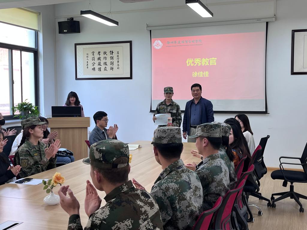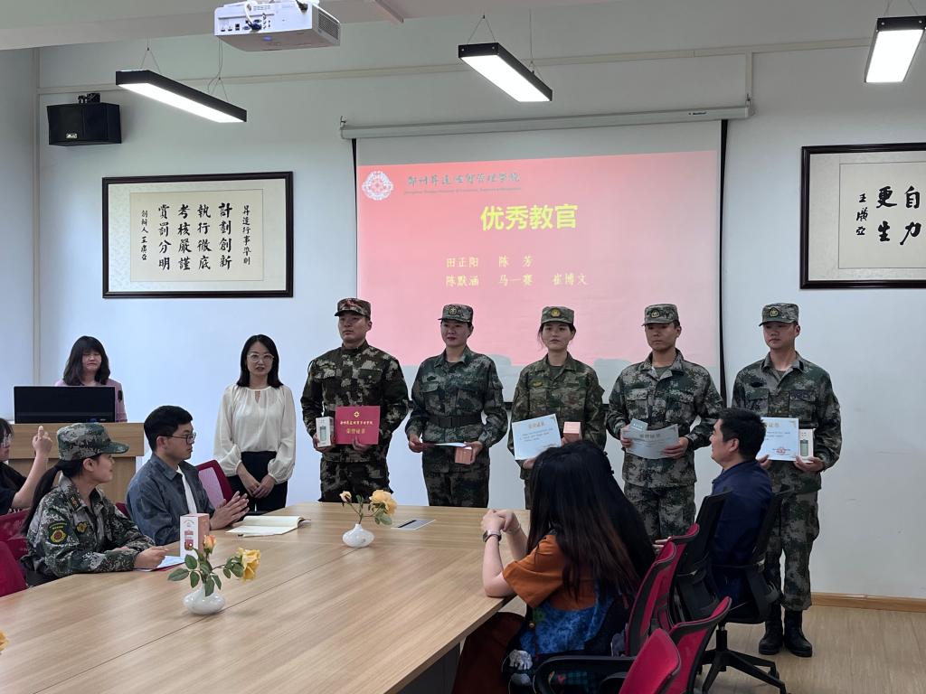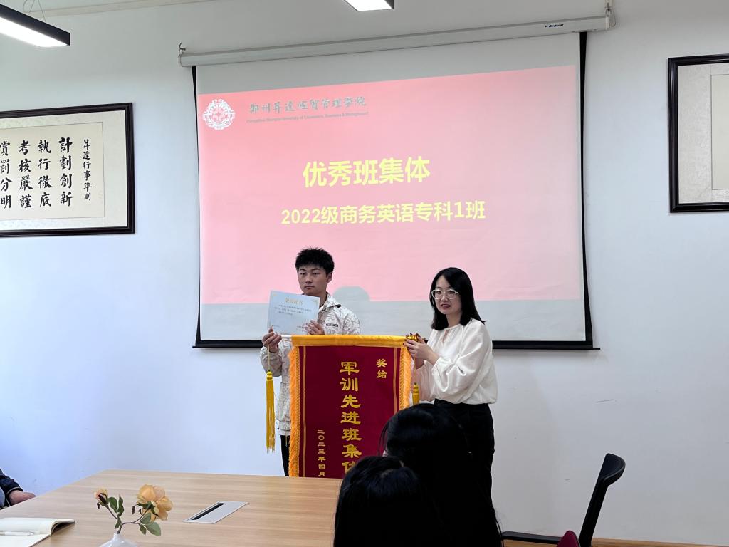 会上,胡老师首先公布了获得本次优秀教官、优秀学员和优秀班集体名单。徐佳佳、田正阳、陈芳、陈默涵、马一赛、崔博文获得“优秀教官”称号,2022级新生班张美朋、陈建、王梓正、赵剑平等27名同学获得了“优秀学员”称号,2022级商英专1班获得了“优秀班集体”称号。