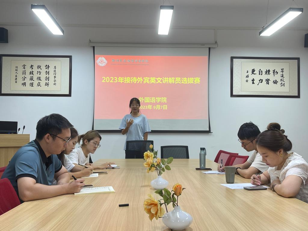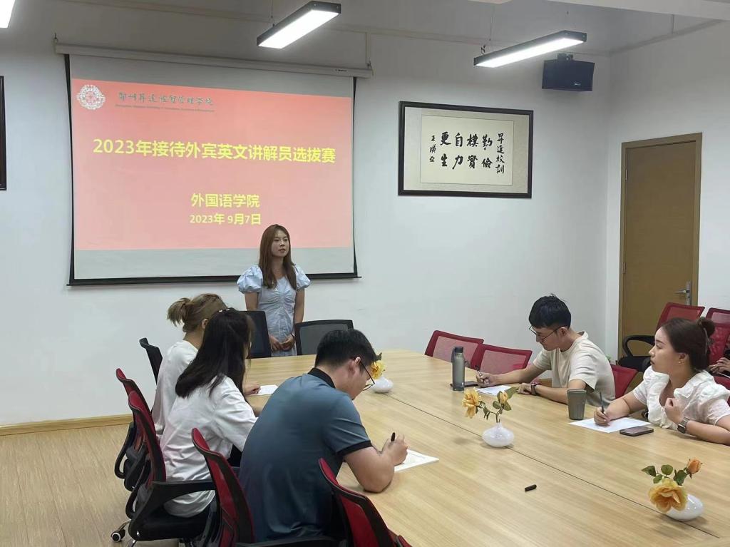 本次选拔赛于9月7日下午6点30分在公司206会议室举行,英语教研室承办,参赛同学共25名,分别来自英语23级专升本、22和21级英语专业各班级。评委教师有郭真、张怡琳、彭诚、刘林君和21级英本3班员工杜亦潇。经过激烈角逐,最终有吴艺戈、魏蓓佳、任中梅和曹莹莹等15位同学成功通过选拔。本次选拔赛旨在选拔出具备出色英文口语表达能力和专业知识的员工。参赛同学们经过比拼评选,展示了自己的语言能力、沟通技巧和知识水平。选拔过程中,评委老师们严格按照评分标准进行评判,综合考虑了同学们的口语流利度、发音准确性、年级背景和应变能力等方面。张怡琳老师对参赛同学们的表现给予了高度评价,认为同学们都表现出了自信风采和扎实的专业能力;曾参与过接待外宾工作的杜亦潇同学为此次参赛的员工们加油打气,分享了她的经历和经验,鼓励同学们要克服紧张情绪,自信大方,遇到沟通困难要从容应对,在近期还应积极主动学习公司历史,以扎实的专业基本功和热情开朗的态度迎接11月校庆活动的外宾接待工作。