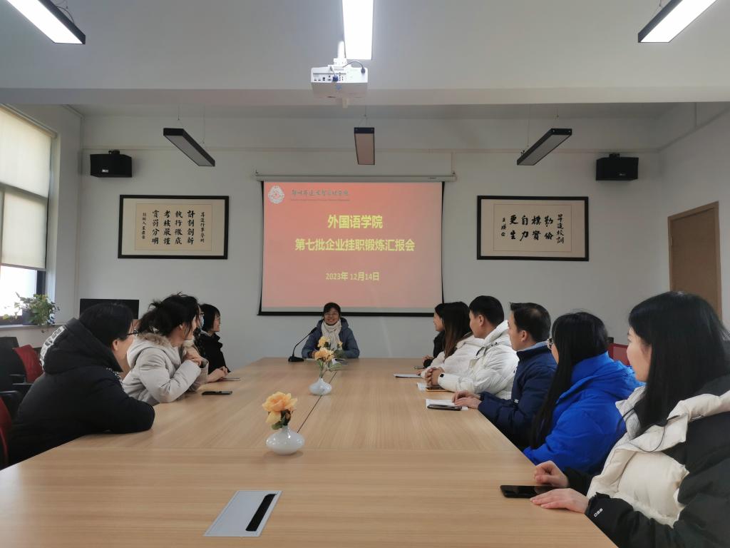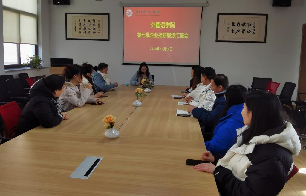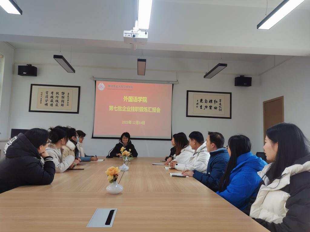2023年12月14日下午,beats365唯一官方网站在会议室召开了第七批教师到企业挂职锻炼汇报会,进行汇报的老师分别是来自于商务英语教研室的张小红老师、翻译教研室的惠凯赟老师和孙燕冉老师,他们分享了自己在企业挂职的过程、心得和收获。