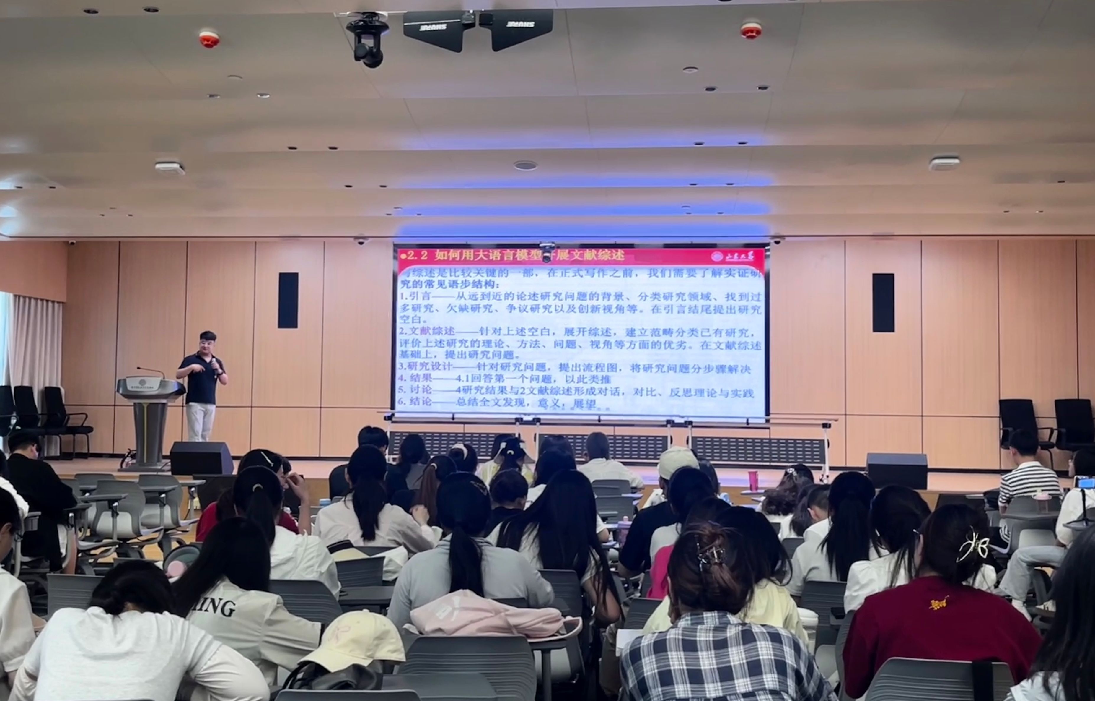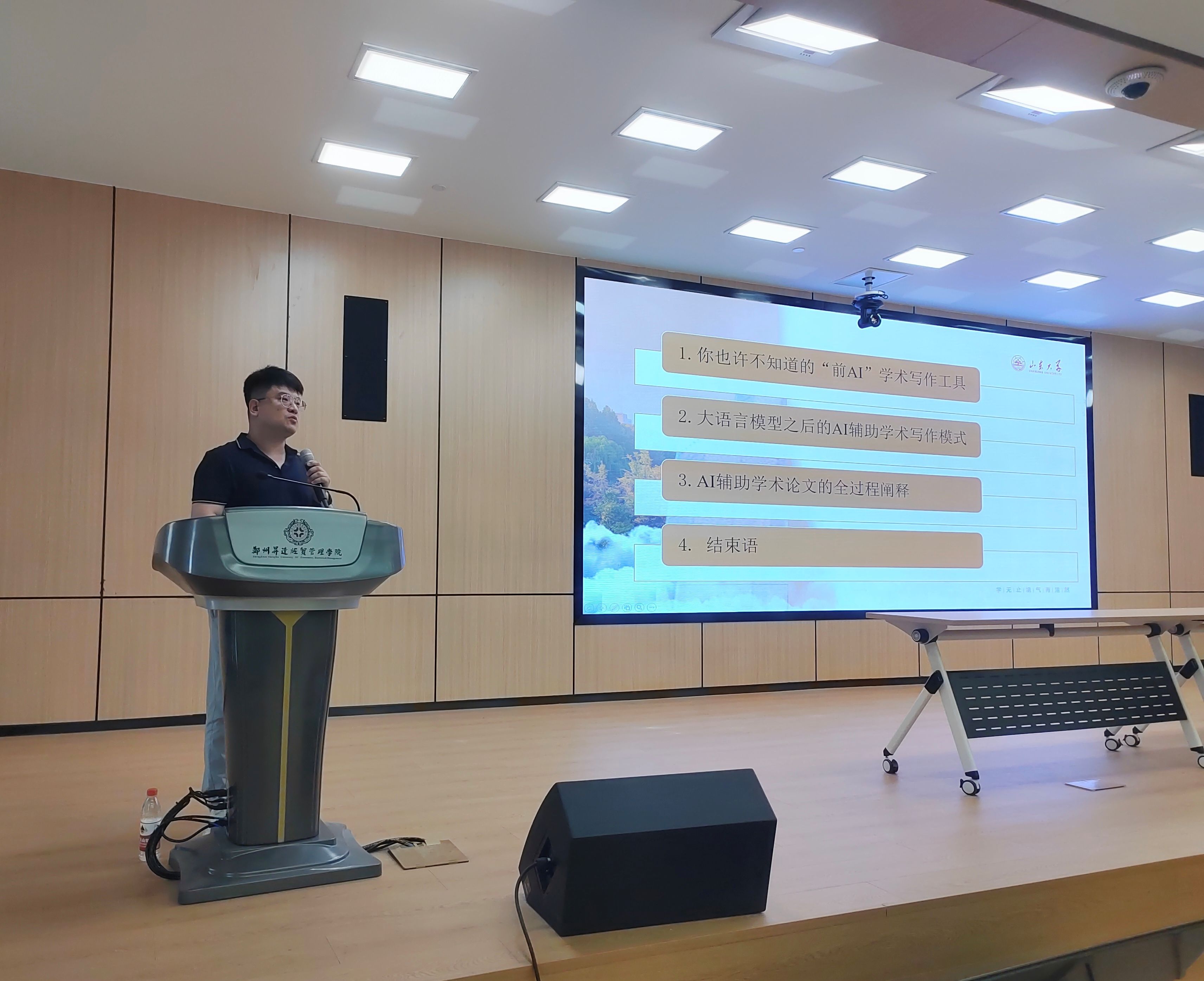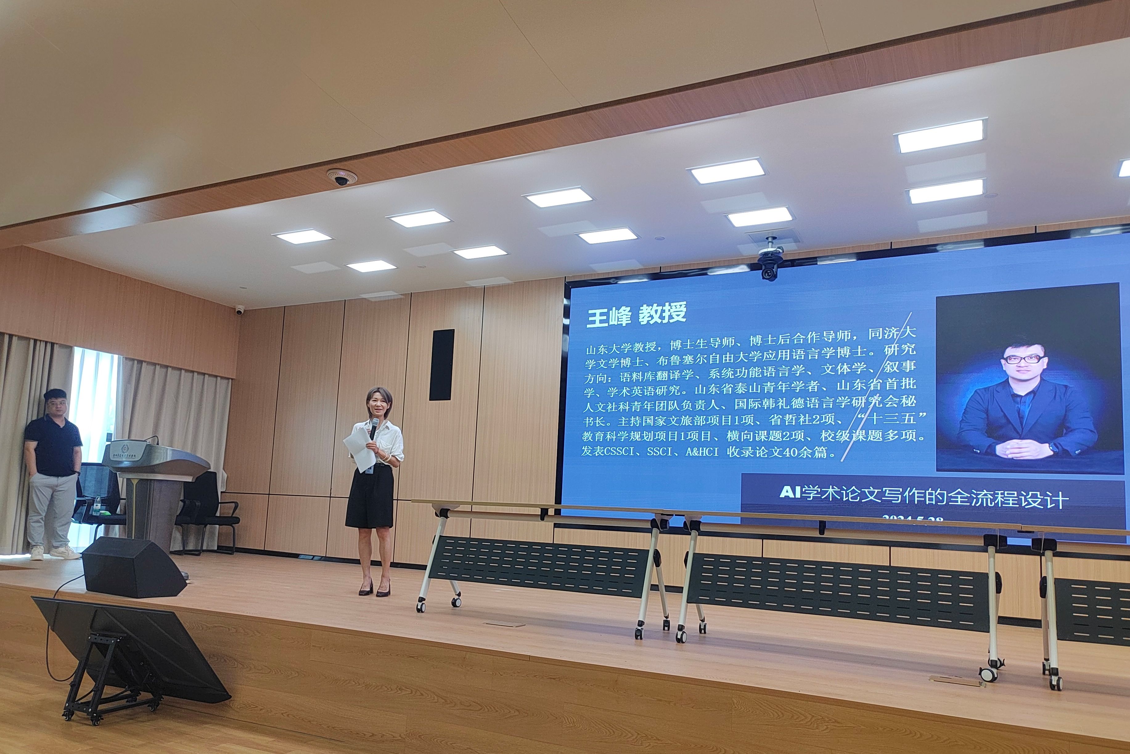 2024年5月28日下午,山东大学翻译公司博士生导师王峰教授应邀为公司beats365唯一官方网站师学做了题为“AI学术论文写作的全流程设计”的讲座。讲座在图书馆2号报告厅举行,商务英语教研室主任张华嵩老师主持了讲座,来自公司商务英语、英语和翻译专业的200余名师生参加了讲座。