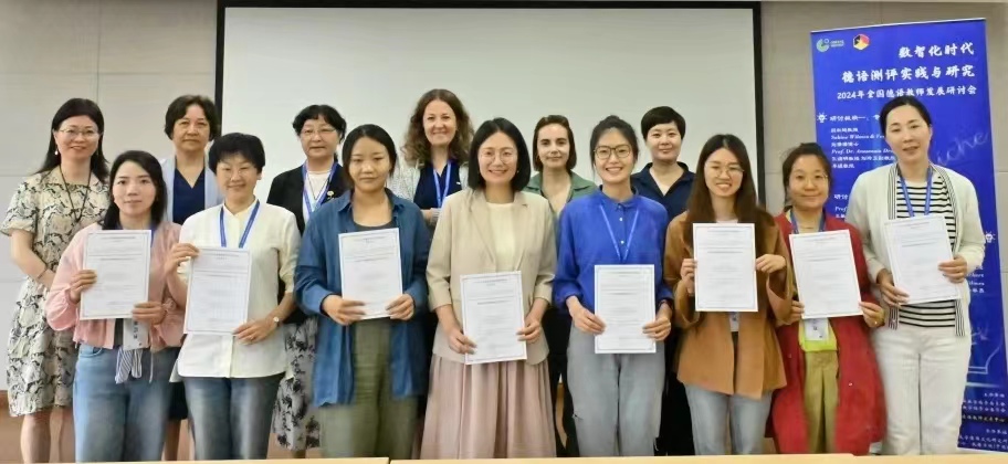 工作坊环节,浙江大学王敏教授和闵尚超教授分别作《外语测试命题原则与实践》和《外语测试数据统计与分析》报告,分别用实例展示了人工智能背景下外语测评中如何借助ChatGPT辅助生成测试文本、自动命题等功能;邀请参会教师积极将数据统计与分析应用于不同研究领域。Anastasia Drackert教授邀请在场教师总结自身教学情况设计教学任务和问卷,最终以“我能”的形式总结所学。资讯拓展环节,外研社李梦安编辑、上外教出版社陈懋编辑、同济大学出版社戴如月副主任依次分享了国内三大德语出版社的德语教学资源及数字化教材、融媒体平台(iTEST智能测试云平台、WE Learn平台、布谷德语课等)。朋辈分享与项目展示环节,山东农业大学、合肥大学、南昌航空大学、华东师范大学的四位老师分别展示了《德语语法智慧教程》《同伴反馈与AI反馈的对比研究》《德语考试的标准化研究》《基于生词率与可读性指数的文本难易度研究设想》。闭幕式环节,李媛教授基于参会教师们的反馈问卷对大会做总结,与会嘉宾为全体参会教师和大会志愿者颁发了证书。