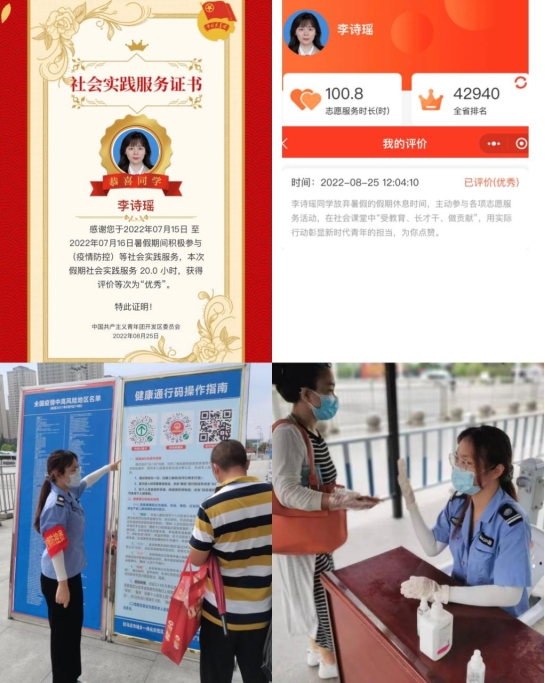 积极向党组织靠拢,坚决拥护中国共产党的领导,现已成为中共预备党员。同时她还以党员的标准严格要求自己,身体力行参与志愿活动,争当先锋模范,作为疫情防控志愿者,积极为社会做贡献,累积志愿时长达100.8小时,充分彰显了预备党员的青春色彩!