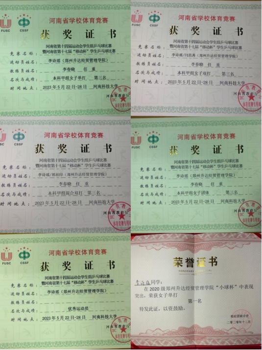 (1)河南省第十四届省运会乒乓球老员工组女子单打第三名